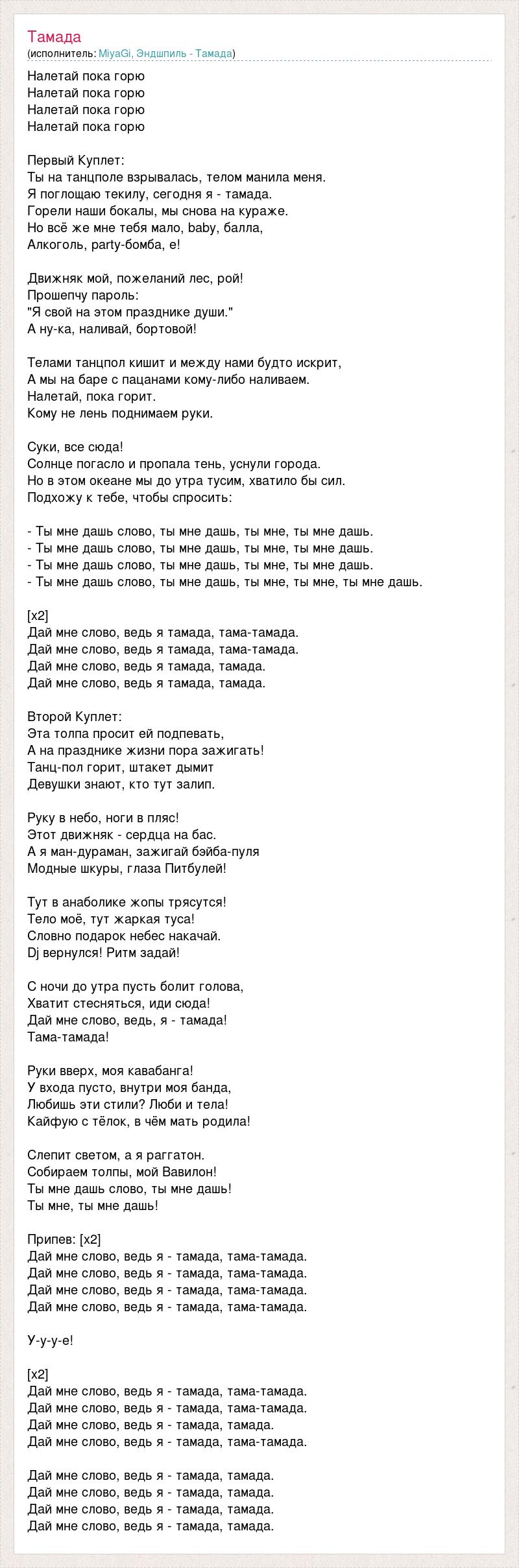 Налетай пока горю Налетай пока горю Налетай пока горю Налетай пока горю Первый Куплет: Ты на танцполе взрывалась, телом манила меня. Я поглощаю текилу, сегодня я - тамада. Горели наши бокалы, мы снова на кураже. Но всё же мне тебя мало, baby, балла, Алкоголь, party-бомба, е! Движняк мой, пожеланий лес, рой! Прошепчу пароль: "Я свой на этом празднике души." А ну-ка, наливай, бортовой! Телами танцпол кишит и между нами будто искрит, А мы на баре с пацанами кому-либо наливаем. Налетай, пока горит. Кому не лень поднимаем руки. Суки, все сюда! Солнце погасло и пропала тень, уснули города. Но в этом океане мы до утра тусим, хватило бы сил. Подхожу к тебе, чтобы спросить: - Ты мне дашь слово, ты мне дашь, ты мне, ты мне дашь. - Ты мне дашь слово, ты мне дашь, ты мне, ты мне дашь. - Ты мне дашь слово, ты мне дашь, ты мне, ты мне дашь. - Ты мне дашь слово, ты мне дашь, ты мне, ты мне, ты мне дашь. [х2] Дай мне слово, ведь я тамада, тама-тамада. Дай мне слово, ведь я тамада, тама-тамада. Дай мне слово, ведь я тамада, тамада. Дай мне слово, ведь я тамада, тамада. Второй Куплет: Эта толпа просит ей подпевать, А на празднике жизни пора зажигать! Танц-пол горит, штакет дымит Девушки знают, кто тут залип. Руку в небо, ноги в пляс! Этот движняк - сердца на бас. А я ман-дураман, зажигай бэйба-пуля Модные шкуры, глаза Питбулей! Тут в анаболике жопы трясутся! Тело моё, тут жаркая туса! Словно подарок небес накачай. Dj вернулся! Ритм задай! С ночи до утра пусть болит голова, Хватит стесняться, иди сюда! Дай мне слово, ведь, я - тамада! Тама-тамада! Руки вверх, моя кавабанга! У входа пусто, внутри моя банда, Любишь эти стили? Люби и тела! Кайфую с тёлок, в чём мать родила! Слепит светом, а я раггатон. Собираем толпы, мой Вавилон! Ты мне дашь слово, ты мне дашь! Ты мне, ты мне дашь! Припев: [х2] Дай мне слово, ведь я - тамада, тама-тамада. Дай мне слово, ведь я - тамада, тама-тамада. Дай мне слово, ведь я - тамада, тама-тамада. Дай мне слово, ведь я - тамада, тама-тамада. У-у-у-е! [х2] Дай мне слово, ведь я - тамада, тама-тамада. Дай мне слово, ведь я - тамада, тама-тамада. Дай мне слово, ведь я - тамада, тамада. Дай мне слово, ведь я - тамада, тама-тамада. Дай мне слово, ведь я - тамада, тамада. Дай мне слово, ведь я - тамада, тамада. Дай мне слово, ведь я - тамада, тамада. Дай мне слово, ведь я - тамада, тамада.