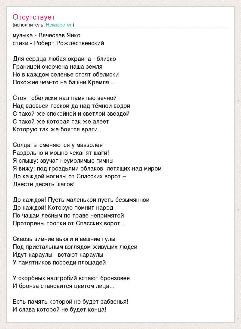 музыка - Вячеслав Янко стихи - Роберт Рождественский Для сердца любая окраина - близко Границей очерчена наша земля Но в каждом селенье стоят обелиски Похожие чем-то на башни Кремля... Стоят обелиски над памятью вечной Над вдовьей тоской да над тёмной водой С такой же спокойной и светлой звездой С такой же которая так же алеет Которую так же боятся враги... Солдаты сменяются у мавзолея Раздольно и мощно чеканят шаги! Я слышу: звучат неумолимые гимны Я вижу: под гроздьями облаков летящих над миром До каждой могилы от Спасских ворот – Двести десять шагов! До каждой! Пусть маленькой пусть безымянной До каждой! Которую помнит народ По чащам лесным по траве непримятой Проторены тропки от Спасских ворот... Сквозь зимние вьюги и вешние гулы Под пристальным взглядом живущих людей Идут караулы встают караулы У памятников посреди площадей У скорбных надгробий встают бронзовея И бронза становится цветом лица... Есть память которой не будет забвенья! И слава которой не будет конца!