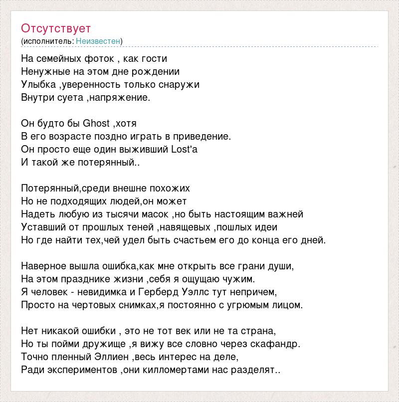 На семейных фоток , как гости Ненужные на этом дне рождении Улыбка ,уверенность только снаружи Внутри суета ,напряжение. Он будто бы Ghost ,хотя В его возрасте поздно играть в приведение. Он просто еще один выживший Lost'a И такой же потерянный.. Потерянный,среди внешне похожих Но не подходящих людей,он может Надеть любую из тысячи масок ,но быть настоящим важней Уставший от прошлых теней ,навящевых ,пошлых идеи Но где найти тех,чей удел быть счастьем его до конца его дней. Наверное вышла ошибка,как мне открыть все грани души, На этом празднике жизни ,себя я ощущаю чужим. Я человек - невидимка и Герберд Уэллс тут непричем, Просто на чертовых снимках,я постоянно с угрюмым лицом. Нет никакой ошибки , это не тот век или не та страна, Но ты пойми дружище ,я вижу все словно через скафандр. Точно пленный Эллиен ,весь интерес на деле, Ради экспериментов ,они килломертами нас разделят..