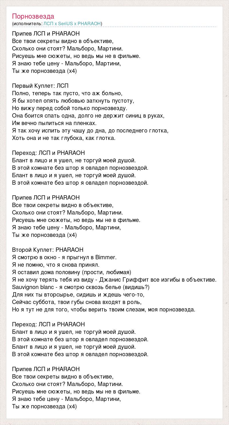 Припев ЛСП и PHARAOH Все твои секреты видно в объективе, Сколько они стоят? Мальборо, Мартини. Рисуешь мне сюжеты, но ведь мы не в фильме. Я знаю тебе цену - Мальборо, Мартини, Ты же порнозвезда (х4) Первый Куплет: ЛСП Полно, теперь так пусто, что аж больно, Я бы хотел опять любовью заткнуть пустоту, Но вижу перед собой только порнозвезду. Она боится спать одна, долго не держит синиц в руках, Им вечно пылиться на пленках. Я так хочу испить эту чашу до дна, до последнего глотка, Хоть она и не так глубока, как глотка. Переход: ЛСП и PHARAOH Блант в лицо и я ушел, не торгуй моей душой. В этой комнате без штор я овладел порнозвездой. Блант в лицо и я ушел, не торгуй моей душой. В этой комнате без штор я овладел порнозвездой. Припев ЛСП и PHARAOH Все твои секреты видно в объективе, Сколько они стоят? Мальборо, Мартини. Рисуешь мне сюжеты, но ведь мы не в фильме. Я знаю тебе цену - Мальборо, Мартини, Ты же порнозвезда (х4) Второй Куплет: PHARAOH Я смотрю в окно - я прыгнул в Bimmer. Я не помню, что я снова принял. Я оставил дома половину (прости, любимая) Я не хочу терять тебя из виду - Джанис Гриффит все изгибы в объективе. Sauvignon blanc - я смотрю сквозь белье (видишь?) Для них ты вторсырье, сидишь и ждешь чего-то, Сейчас суббота, твои губы снова входят в роль, Но я тут не для того, чтобы верить твоим слезам, моя порнозвезда. Переход: ЛСП и PHARAOH Блант в лицо и я ушел, не торгуй моей душой. В этой комнате без штор я овладел порнозвездой. Блант в лицо и я ушел, не торгуй моей душой. В этой комнате без штор я овладел порнозвездой. Припев ЛСП и PHARAOH Все твои секреты видно в объективе, Сколько они стоят? Мальборо, Мартини. Рисуешь мне сюжеты, но ведь мы не в фильме. Я знаю тебе цену - Мальборо, Мартини, Ты же порнозвезда (х4)