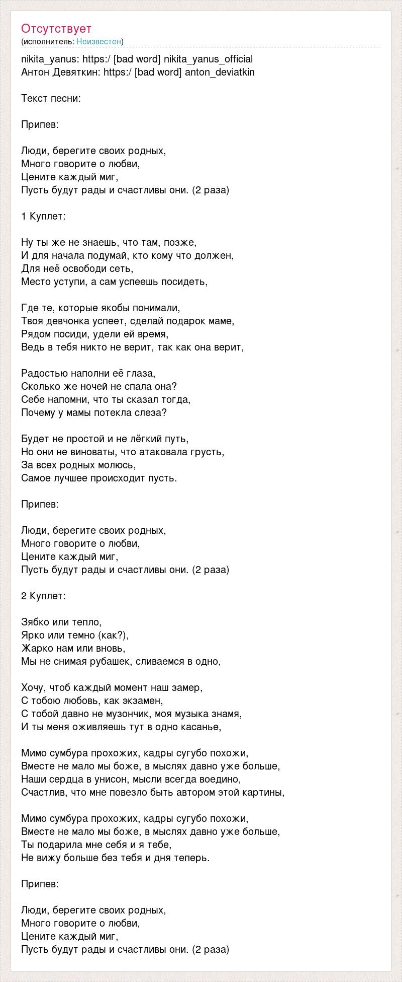 nikita_yanus: https:/ [bad word] nikita_yanus_official Антон Девяткин: https:/ [bad word] anton_deviatkin Текст песни: Припев: Люди, берегите своих родных, Много говорите о любви, Цените каждый миг, Пусть будут рады и счастливы они. (2 раза) 1 Куплет: Ну ты же не знаешь, что там, позже, И для начала подумай, кто кому что должен, Для неё освободи сеть, Место уступи, а сам успеешь посидеть, Где те, которые якобы понимали, Твоя девчонка успеет, сделай подарок маме, Рядом посиди, удели ей время, Ведь в тебя никто не верит, так как она верит, Радостью наполни её глаза, Сколько же ночей не спала она? Себе напомни, что ты сказал тогда, Почему у мамы потекла слеза? Будет не простой и не лёгкий путь, Но они не виноваты, что атаковала грусть, За всех родных молюсь, Самое лучшее происходит пусть. Припев: Люди, берегите своих родных, Много говорите о любви, Цените каждый миг, Пусть будут рады и счастливы они. (2 раза) 2 Куплет: Зябко или тепло, Ярко или темно (как?), Жарко нам или вновь, Мы не снимая рубашек, сливаемся в одно, Хочу, чтоб каждый момент наш замер, С тобою любовь, как экзамен, С тобой давно не музончик, моя музыка знамя, И ты меня оживляешь тут в одно касанье, Мимо сумбура прохожих, кадры сугубо похожи, Вместе не мало мы боже, в мыслях давно уже больше, Наши сердца в унисон, мысли всегда воедино, Счастлив, что мне повезло быть автором этой картины, Мимо сумбура прохожих, кадры сугубо похожи, Вместе не мало мы боже, в мыслях давно уже больше, Ты подарила мне себя и я тебе, Не вижу больше без тебя и дня теперь. Припев: Люди, берегите своих родных, Много говорите о любви, Цените каждый миг, Пусть будут рады и счастливы они. (2 раза)