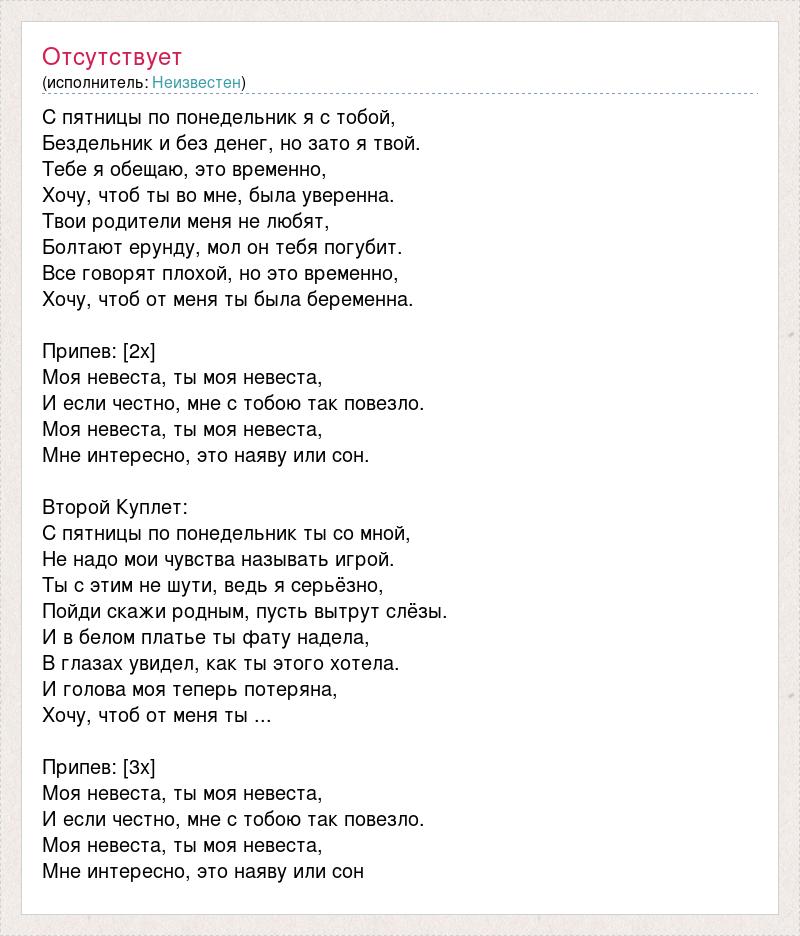 С пятницы по понедельник я с тобой, Бездельник и без денег, но зато я твой. Тебе я обещаю, это временно, Хочу, чтоб ты во мне, была уверенна. Твои родители меня не любят, Болтают ерунду, мол он тебя погубит. Все говорят плохой, но это временно, Хочу, чтоб от меня ты была беременна. Припев: [2х] Моя невеста, ты моя невеста, И если честно, мне с тобою так повезло. Моя невеста, ты моя невеста, Мне интересно, это наяву или сон. Второй Куплет: С пятницы по понедельник ты со мной, Не надо мои чувства называть игрой. Ты с этим не шути, ведь я серьёзно, Пойди скажи родным, пусть вытрут слёзы. И в белом платье ты фату надела, В глазах увидел, как ты этого хотела. И голова моя теперь потеряна, Хочу, чтоб от меня ты ... Припев: [3х] Моя невеста, ты моя невеста, И если честно, мне с тобою так повезло. Моя невеста, ты моя невеста, Мне интересно, это наяву или сон