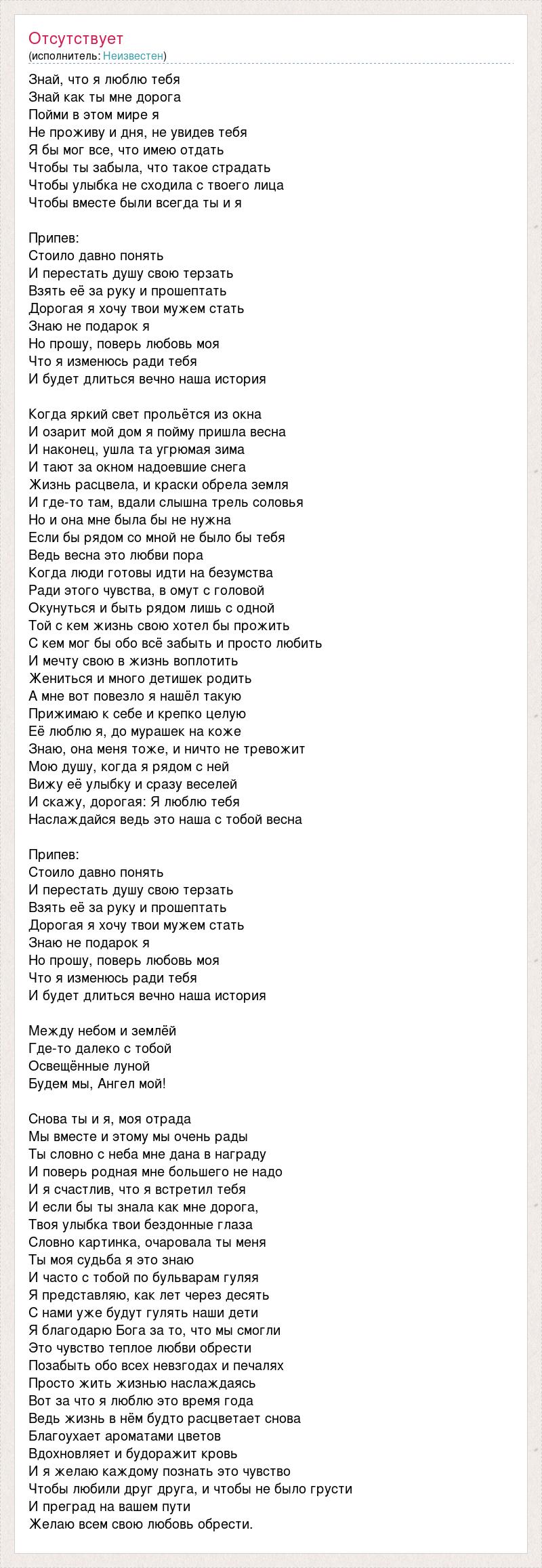 Знай, что я люблю тебя Знай как ты мне дорога Пойми в этом мире я Не проживу и дня, не увидев тебя Я бы мог все, что имею отдать Чтобы ты забыла, что такое страдать Чтобы улыбка не сходила с твоего лица Чтобы вместе были всегда ты и я Припев: Стоило давно понять И перестать душу свою терзать Взять её за руку и прошептать Дорогая я хочу твои мужем стать Знаю не подарок я Но прошу, поверь любовь моя Что я изменюсь ради тебя И будет длиться вечно наша история Когда яркий свет прольётся из окна И озарит мой дом я пойму пришла весна И наконец, ушла та угрюмая зима И тают за окном надоевшие снега Жизнь расцвела, и краски обрела земля И где-то там, вдали слышна трель соловья Но и она мне была бы не нужна Если бы рядом со мной не было бы тебя Ведь весна это любви пора Когда люди готовы идти на безумства Ради этого чувства, в омут с головой Окунуться и быть рядом лишь с одной Той с кем жизнь свою хотел бы прожить С кем мог бы обо всё забыть и просто любить И мечту свою в жизнь воплотить Жениться и много детишек родить А мне вот повезло я нашёл такую Прижимаю к себе и крепко целую Её люблю я, до мурашек на коже Знаю, она меня тоже, и ничто не тревожит Мою душу, когда я рядом с ней Вижу её улыбку и сразу веселей И скажу, дорогая: Я люблю тебя Наслаждайся ведь это наша с тобой весна Припев: Стоило давно понять И перестать душу свою терзать Взять её за руку и прошептать Дорогая я хочу твои мужем стать Знаю не подарок я Но прошу, поверь любовь моя Что я изменюсь ради тебя И будет длиться вечно наша история Между небом и землёй Где-то далеко с тобой Освещённые луной Будем мы, Ангел мой! Снова ты и я, моя отрада Мы вместе и этому мы очень рады Ты словно с неба мне дана в награду И поверь родная мне большего не надо И я счастлив, что я встретил тебя И если бы ты знала как мне дорога, Твоя улыбка твои бездонные глаза Словно картинка, очаровала ты меня Ты моя судьба я это знаю И часто с тобой по бульварам гуляя Я представляю, как лет через десять С нами уже будут гулять наши дети Я благодарю Бога за то, что мы смогли Это чувство теплое любви обрести Позабыть обо всех невзгодах и печалях Просто жить жизнью наслаждаясь Вот за что я люблю это время года Ведь жизнь в нём будто расцветает снова Благоухает ароматами цветов Вдохновляет и будоражит кровь И я желаю каждому познать это чувство Чтобы любили друг друга, и чтобы не было грусти И преград на вашем пути Желаю всем свою любовь обрести.