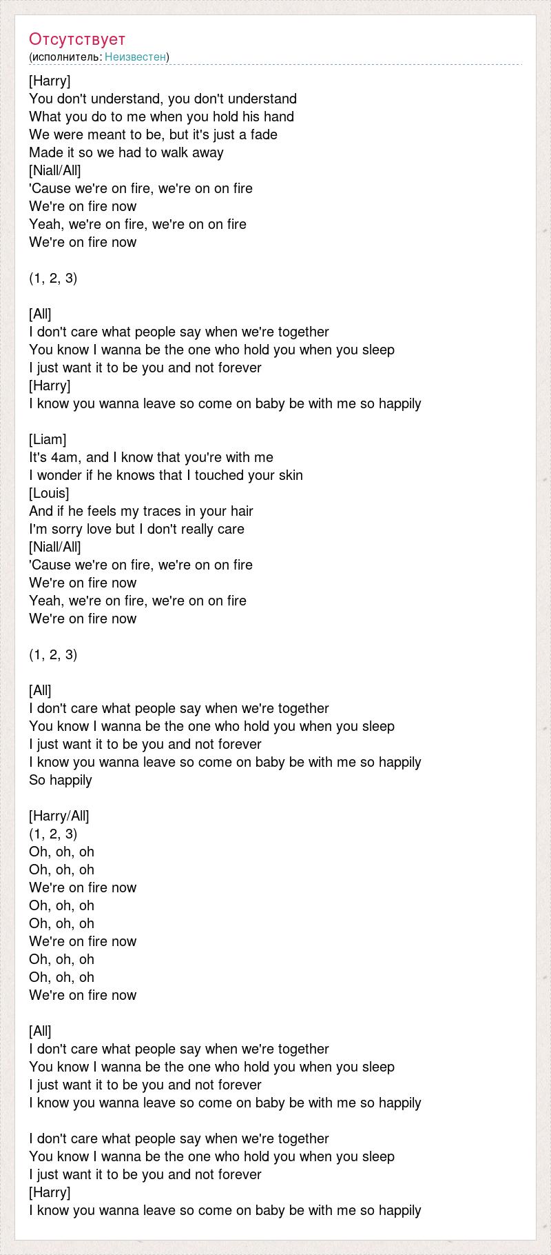 [Harry] You don't understand, you don't understand What you do to me when you hold his hand We were meant to be, but it's just a fade Made it so we had to walk away [Niall/All] 'Cause we're on fire, we're on on fire We're on fire now Yeah, we're on fire, we're on on fire We're on fire now (1, 2, 3) [All] I don't care what people say when we're together You know I wanna be the one who hold you when you sleep I just want it to be you and not forever [Harry] I know you wanna leave so come on baby be with me so happily [Liam] It's 4am, and I know that you're with me I wonder if he knows that I touched your skin [Louis] And if he feels my traces in your hair I'm sorry love but I don't really care [Niall/All] 'Cause we're on fire, we're on on fire We're on fire now Yeah, we're on fire, we're on on fire We're on fire now (1, 2, 3) [All] I don't care what people say when we're together You know I wanna be the one who hold you when you sleep I just want it to be you and not forever I know you wanna leave so come on baby be with me so happily So happily [Harry/All] (1, 2, 3) Oh, oh, oh Oh, oh, oh We're on fire now Oh, oh, oh Oh, oh, oh We're on fire now Oh, oh, oh Oh, oh, oh We're on fire now [All] I don't care what people say when we're together You know I wanna be the one who hold you when you sleep I just want it to be you and not forever I know you wanna leave so come on baby be with me so happily I don't care what people say when we're together You know I wanna be the one who hold you when you sleep I just want it to be you and not forever [Harry] I know you wanna leave so come on baby be with me so happily