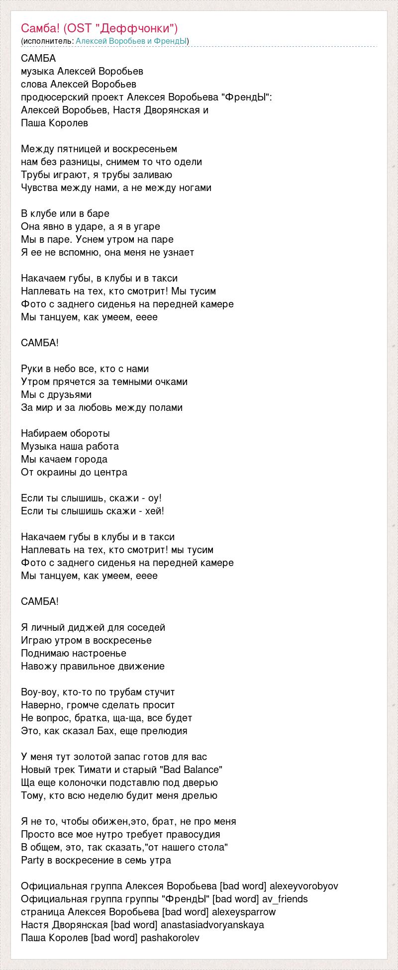САМБА музыка Алексей Воробьев слова Алексей Воробьев продюсерский проект Алексея Воробьева "ФрендЫ": Алексей Воробьев, Настя Дворянская и Паша Королев Между пятницей и воскресеньем нам без разницы, снимем то что одели Трубы играют, я трубы заливаю Чувства между нами, а не между ногами В клубе или в баре Она явно в ударе, а я в угаре Мы в паре. Уснем утром на паре Я ее не вспомню, она меня не узнает Накачаем губы, в клубы и в такси Наплевать на тех, кто смотрит! Мы тусим Фото с заднего сиденья на передней камере Мы танцуем, как умеем, ееее САМБА! Руки в небо все, кто с нами Утром прячется за темными очками Мы с друзьями За мир и за любовь между полами Набираем обороты Музыка наша работа Мы качаем города От окраины до центра Если ты слышишь, скажи - оу! Если ты слышишь скажи - хей! Накачаем губы в клубы и в такси Наплевать на тех, кто смотрит! мы тусим Фото с заднего сиденья на передней камере Мы танцуем, как умеем, ееее САМБА! Я личный диджей для соседей Играю утром в воскресенье Поднимаю настроенье Навожу правильное движение Воу-воу, кто-то по трубам стучит Наверно, громче сделать просит Не вопрос, братка, ща-ща, все будет Это, как сказал Бах, еще прелюдия У меня тут золотой запас готов для вас Новый трек Тимати и старый "Bad Balance" Ща еще колоночки подставлю под дверью Тому, кто всю неделю будит меня дрелью Я не то, чтобы обижен,это, брат, не про меня Просто все мое нутро требует правосудия В общем, это, так сказать,"от нашего стола" Party в воскресение в семь утра Официальная группа Алексея Воробьева [bad word] alexeyvorobyov Официальная группа группы "ФрендЫ" [bad word] av_friends страница Алексея Воробьева [bad word] alexeysparrow Настя Дворянская [bad word] anastasiadvoryanskaya Паша Королев [bad word] pashakorolev