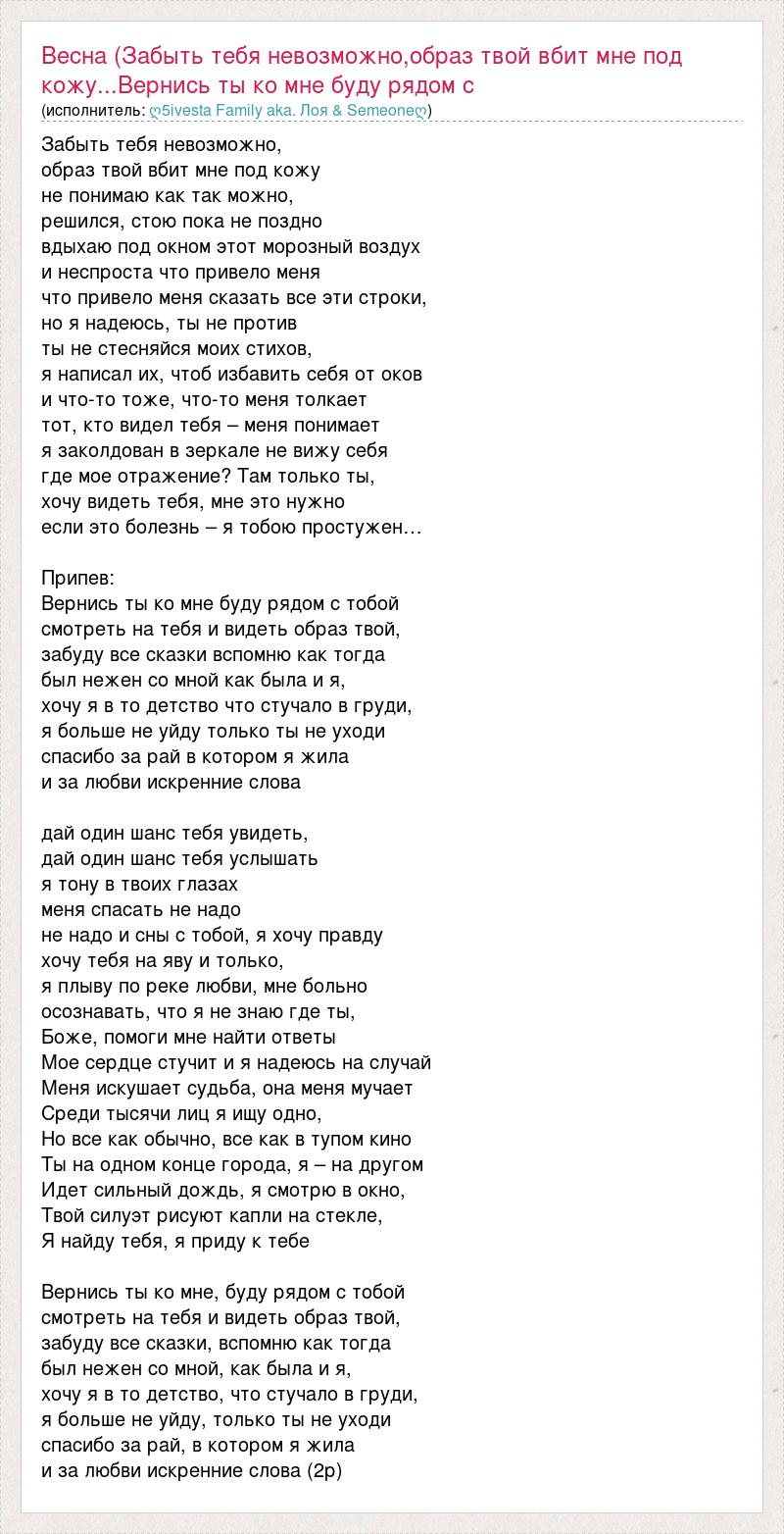 Забыть тебя невозможно, образ твой вбит мне под кожу не понимаю как так можно, решился, стою пока не поздно вдыхаю под окном этот морозный воздух и неспроста что привело меня что привело меня сказать все эти строки, но я надеюсь, ты не против ты не стесняйся моих стихов, я написал их, чтоб избавить себя от оков и что-то тоже, что-то меня толкает тот, кто видел тебя – меня понимает я заколдован в зеркале не вижу себя где мое отражение? Там только ты, хочу видеть тебя, мне это нужно если это болезнь – я тобою простужен… Припев: Вернись ты ко мне буду рядом с тобой смотреть на тебя и видеть образ твой, забуду все сказки вспомню как тогда был нежен со мной как была и я, хочу я в то детство что стучало в груди, я больше не уйду только ты не уходи спасибо за рай в котором я жила и за любви искренние слова дай один шанс тебя увидеть, дай один шанс тебя услышать я тону в твоих глазах меня спасать не надо не надо и сны с тобой, я хочу правду хочу тебя на яву и только, я плыву по реке любви, мне больно осознавать, что я не знаю где ты, Боже, помоги мне найти ответы Мое сердце стучит и я надеюсь на случай Меня искушает судьба, она меня мучает Среди тысячи лиц я ищу одно, Но все как обычно, все как в тупом кино Ты на одном конце города, я – на другом Идет сильный дождь, я смотрю в окно, Твой силуэт рисуют капли на стекле, Я найду тебя, я приду к тебе Вернись ты ко мне, буду рядом с тобой смотреть на тебя и видеть образ твой, забуду все сказки, вспомню как тогда был нежен со мной, как была и я, хочу я в то детство, что стучало в груди, я больше не уйду, только ты не уходи спасибо за рай, в котором я жила и за любви искренние слова (2р)