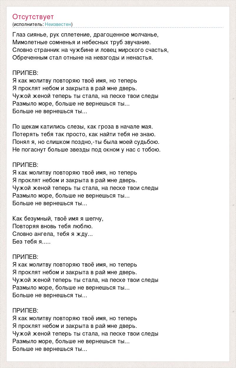 Глаз сиянье, рук сплетение, драгоценное молчанье, Мимолетные сомненья и небесных труб звучание. Словно странник на чужбине и ловец мирского счастья, Обреченным стал отныне на невзгоды и ненастья. ПРИПЕВ: Я как молитву повторяю твоё имя, но теперь Я проклят небом и закрыта в рай мне дверь. Чужой женой теперь ты стала, на песке твои следы Размыло море, больше не вернешься ты... Больше не вернешься ты... По щекам катились слезы, как гроза в начале мая. Потерять тебя так просто, как найти тебя не знаю. Понял я, но слишком поздно,-ты была моей судьбою. Не погаснут больше звезды под окном у нас с тобою. ПРИПЕВ: Я как молитву повторяю твоё имя, но теперь Я проклят небом и закрыта в рай мне дверь. Чужой женой теперь ты стала, на песке твои следы Размыло море, больше не вернешься ты... Больше не вернешься ты... Как безумный, твоё имя я шепчу, Повторяя вновь тебя люблю. Словно ангела, тебя я жду... Без тебя я..... ПРИПЕВ: Я как молитву повторяю твоё имя, но теперь Я проклят небом и закрыта в рай мне дверь. Чужой женой теперь ты стала, на песке твои следы Размыло море, больше не вернешься ты... Больше не вернешься ты... ПРИПЕВ: Я как молитву повторяю твоё имя, но теперь Я проклят небом и закрыта в рай мне дверь. Чужой женой теперь ты стала, на песке твои следы Размыло море, больше не вернешься ты... Больше не вернешься ты...