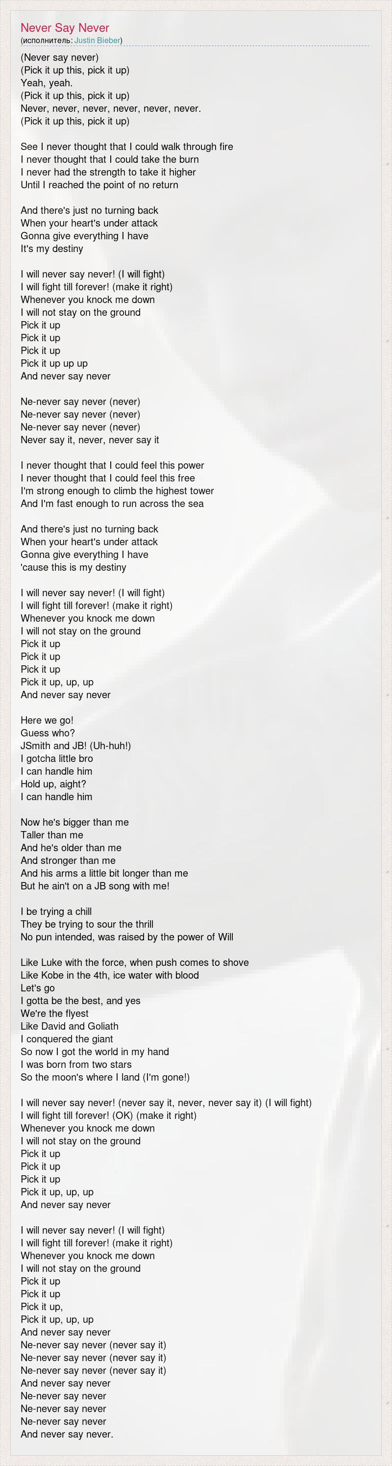 (Never say never) (Pick it up this, pick it up) Yeah, yeah. (Pick it up this, pick it up) Never, never, never, never, never, never. (Pick it up this, pick it up) See I never thought that I could walk through fire I never thought that I could take the burn I never had the strength to take it higher Until I reached the point of no return And there's just no turning back When your heart's under attack Gonna give everything I have It's my destiny I will never say never! (I will fight) I will fight till forever! (make it right) Whenever you knock me down I will not stay on the ground Pick it up Pick it up Pick it up Pick it up up up And never say never Ne-never say never (never) Ne-never say never (never) Ne-never say never (never) Never say it, never, never say it I never thought that I could feel this power I never thought that I could feel this free I'm strong enough to climb the highest tower And I'm fast enough to run across the sea And there's just no turning back When your heart's under attack Gonna give everything I have 'cause this is my destiny I will never say never! (I will fight) I will fight till forever! (make it right) Whenever you knock me down I will not stay on the ground Pick it up Pick it up Pick it up Pick it up, up, up And never say never Here we go! Guess who? JSmith and JB! (Uh-huh!) I gotcha little bro I can handle him Hold up, aight? I can handle him Now he's bigger than me Taller than me And he's older than me And stronger than me And his arms a little bit longer than me But he ain't on a JB song with me! I be trying a chill They be trying to sour the thrill No pun intended, was raised by the power of Will Like Luke with the force, when push comes to shove Like Kobe in the 4th, ice water with blood Let's go I gotta be the best, and yes We're the flyest Like David and Goliath I conquered the giant So now I got the world in my hand I was born from two stars So the moon's where I land (I'm gone!) I will never say never! (never say it, never, never say it) (I will fight) I will fight till forever! (OK) (make it right) Whenever you knock me down I will not stay on the ground Pick it up Pick it up Pick it up Pick it up, up, up And never say never I will never say never! (I will fight) I will fight till forever! (make it right) Whenever you knock me down I will not stay on the ground Pick it up Pick it up Pick it up, Pick it up, up, up And never say never Ne-never say never (never say it) Ne-never say never (never say it) Ne-never say never (never say it) And never say never Ne-never say never Ne-never say never Ne-never say never And never say never.