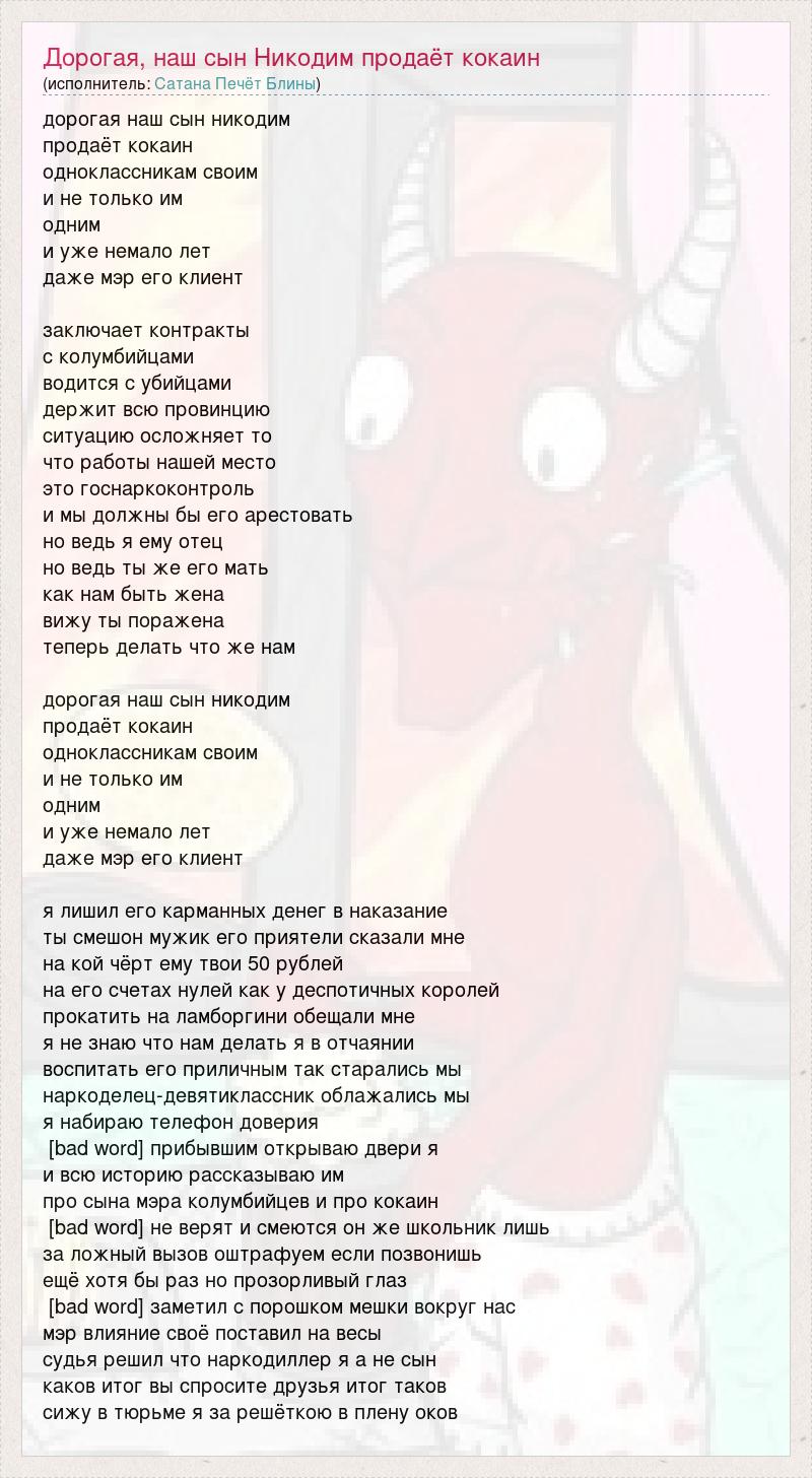 дорогая наш сын никодим продаёт кокаин одноклассникам своим и не только им одним и уже немало лет даже мэр его клиент заключает контракты с колумбийцами водится с убийцами держит всю провинцию ситуацию осложняет то что работы нашей место это госнаркоконтроль и мы должны бы его арестовать но ведь я ему отец но ведь ты же его мать как нам быть жена вижу ты поражена теперь делать что же нам дорогая наш сын никодим продаёт кокаин одноклассникам своим и не только им одним и уже немало лет даже мэр его клиент я лишил его карманных денег в наказание ты смешон мужик его приятели сказали мне на кой чёрт ему твои 50 рублей на его счетах нулей как у деспотичных королей прокатить на ламборгини обещали мне я не знаю что нам делать я в отчаянии воспитать его приличным так старались мы наркоделец-девятиклассник облажались мы я набираю телефон доверия [bad word] прибывшим открываю двери я и всю историю рассказываю им про сына мэра колумбийцев и про кокаин [bad word] не верят и смеются он же школьник лишь за ложный вызов оштрафуем если позвонишь ещё хотя бы раз но прозорливый глаз [bad word] заметил с порошком мешки вокруг нас мэр влияние своё поставил на весы судья решил что наркодиллер я а не сын каков итог вы спросите друзья итог таков сижу в тюрьме я за решёткою в плену оков