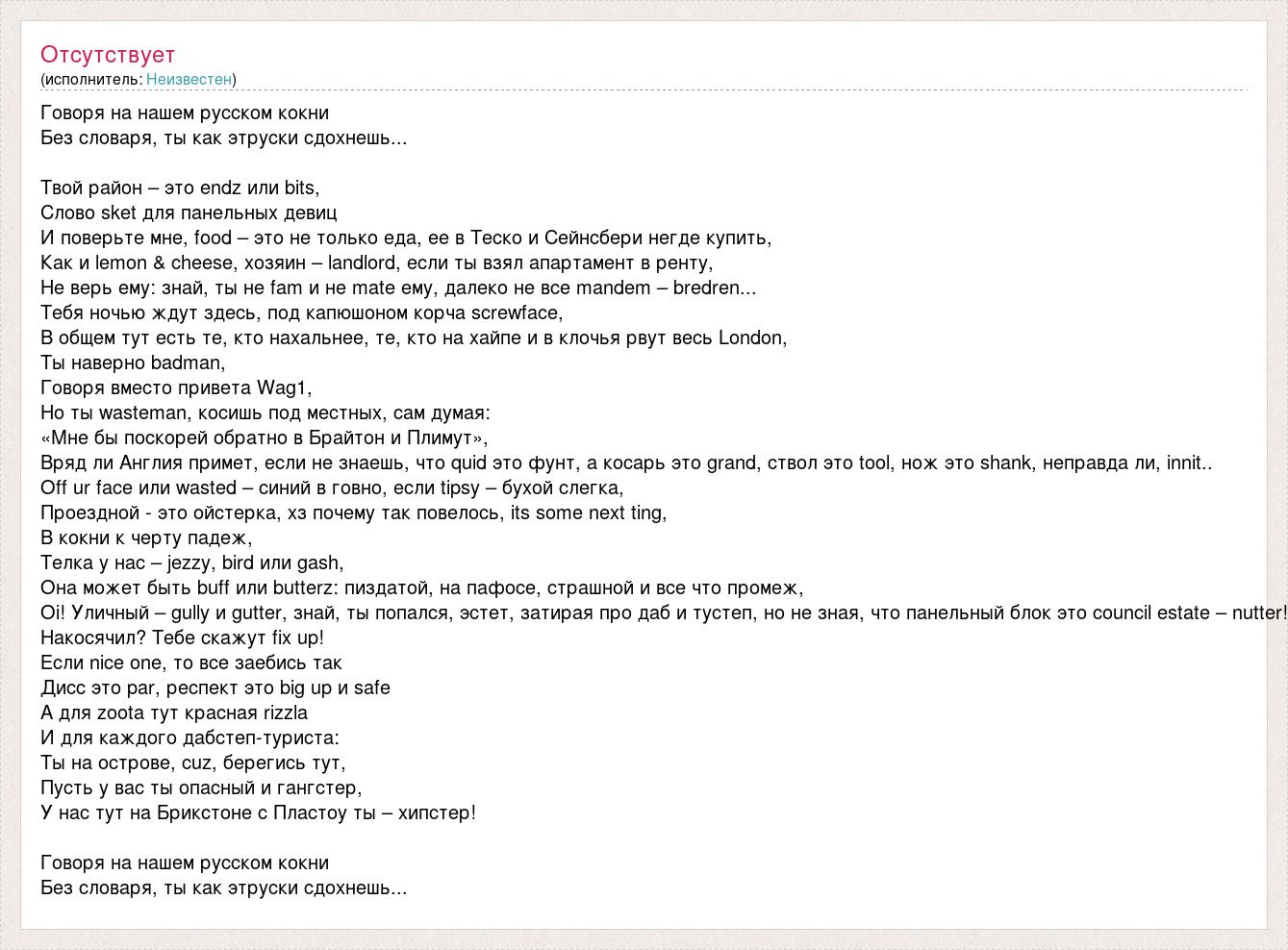 Говоря на нашем русском кокни Без словаря, ты как этруски сдохнешь... Твой район – это endz или bits, Слово sket для панельных девиц И поверьте мне, food – это не только еда, ее в Теско и Сейнсбери негде купить, Как и lemon & cheese, хозяин – landlord, если ты взял апартамент в ренту, Не верь ему: знай, ты не fam и не mate ему, далеко не все mandem – bredren... Тебя ночью ждут здесь, под капюшоном корча screwface, В общем тут есть те, кто нахальнее, те, кто на хайпе и в клочья рвут весь London, Ты наверно badman, Говоря вместо привета Wag1, Но ты wasteman, косишь под местных, сам думая: «Мне бы поскорей обратно в Брайтон и Плимут», Вряд ли Англия примет, если не знаешь, что quid это фунт, а косарь это grand, ствол это tool, нож это shank, неправда ли, innit.. Off ur face или wasted – синий в говно, если tipsy – бухой слегка, Проездной - это ойстерка, хз почему так повелось, its some next ting, В кокни к черту падеж, Телка у нас – jezzy, bird или gash, Она может быть buff или butterz: пиздатой, на пафосе, страшной и все что промеж, Oi! Уличный – gully и gutter, знай, ты попался, эстет, затирая про даб и тустеп, но не зная, что панельный блок это council estate – nutter! Накосячил? Тебе скажут fix up! Если nice one, то все заебись так Дисс это par, респект это big up и safe А для zootа тут красная rizzlа И для каждого дабстеп-туриста: Ты на острове, cuz, берегись тут, Пусть у вас ты опасный и гангстер, У нас тут на Брикстоне с Пластоу ты – хипстер! Говоря на нашем русском кокни Без словаря, ты как этруски сдохнешь...