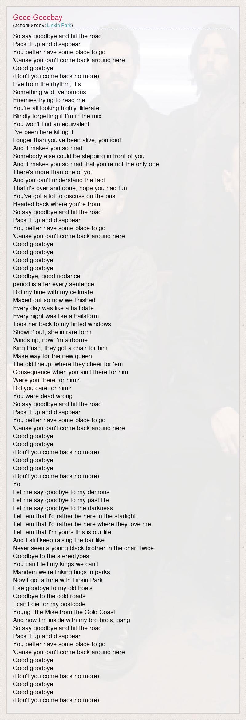 So say goodbye and hit the road Pack it up and disappear You better have some place to go 'Cause you can't come back around here Good goodbye (Don't you come back no more) Live from the rhythm, it's Something wild, venomous Enemies trying to read me You're all looking highly illiterate Blindly forgetting if I'm in the mix You won't find an equivalent I've been here killing it Longer than you've been alive, you idiot And it makes you so mad Somebody else could be stepping in front of you And it makes you so mad that you're not the only one There's more than one of you And you can't understand the fact That it's over and done, hope you had fun You've got a lot to discuss on the bus Headed back where you're from So say goodbye and hit the road Pack it up and disappear You better have some place to go 'Cause you can't come back around here Good goodbye Good goodbye Good goodbye Good goodbye Goodbye, good riddance period is after every sentence Did my time with my cellmate Maxed out so now we finished Every day was like a hail date Every night was like a hailstorm Took her back to my tinted windows Showin' out, she in rare form Wings up, now I'm airborne King Push, they got a chair for him Make way for the new queen The old lineup, where they cheer for 'em Consequence when you ain't there for him Were you there for him? Did you care for him? You were dead wrong So say goodbye and hit the road Pack it up and disappear You better have some place to go 'Cause you can't come back around here Good goodbye Good goodbye (Don't you come back no more) Good goodbye Good goodbye (Don't you come back no more) Yo Let me say goodbye to my demons Let me say goodbye to my past life Let me say goodbye to the darkness Tell 'em that I'd rather be here in the starlight Tell 'em that I'd rather be here where they love me Tell 'em that I'm yours this is our life And I still keep raising the bar like Never seen a young black brother in the chart twice Goodbye to the stereotypes You can't tell my kings we can't Mandem we're linking tings in parks Now I got a tune with Linkin Park Like goodbye to my old hoe’s Goodbye to the cold roads I can't die for my postcode Young little Mike from the Gold Coast And now I'm inside with my bro bro's, gang So say goodbye and hit the road Pack it up and disappear You better have some place to go 'Cause you can't come back around here Good goodbye Good goodbye (Don't you come back no more) Good goodbye Good goodbye (Don't you come back no more)
