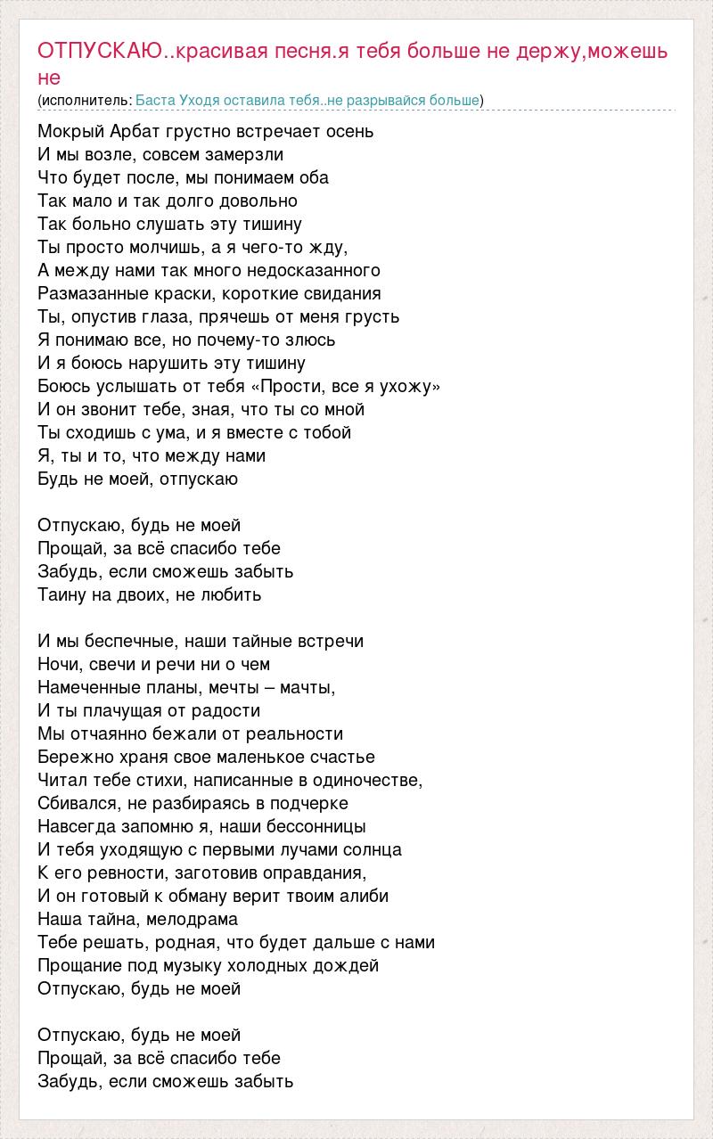 Мокрый Арбат грустно встречает осень И мы возле, совсем замерзли Что будет после, мы понимаем оба Так мало и так долго довольно Так больно слушать эту тишину Ты просто молчишь, а я чего-то жду, А между нами так много недосказанного Размазанные краски, короткие свидания Ты, опустив глаза, прячешь от меня грусть Я понимаю все, но почему-то злюсь И я боюсь нарушить эту тишину Боюсь услышать от тебя «Прости, все я ухожу» И он звонит тебе, зная, что ты со мной Ты сходишь с ума, и я вместе с тобой Я, ты и то, что между нами Будь не моей, отпускаю Отпускаю, будь не моей Прощай, за всё спасибо тебе Забудь, если сможешь забыть Таину на двоих, не любить И мы беспечные, наши тайные встречи Ночи, свечи и речи ни о чем Намеченные планы, мечты – мачты, И ты плачущая от радости Мы отчаянно бежали от реальности Бережно храня свое маленькое счастье Читал тебе стихи, написанные в одиночестве, Сбивался, не разбираясь в подчерке Навсегда запомню я, наши бессонницы И тебя уходящую с первыми лучами солнца К его ревности, заготовив оправдания, И он готовый к обману верит твоим алиби Наша тайна, мелодрама Тебе решать, родная, что будет дальше с нами Прощание под музыку холодных дождей Отпускаю, будь не моей Отпускаю, будь не моей Прощай, за всё спасибо тебе Забудь, если сможешь забыть