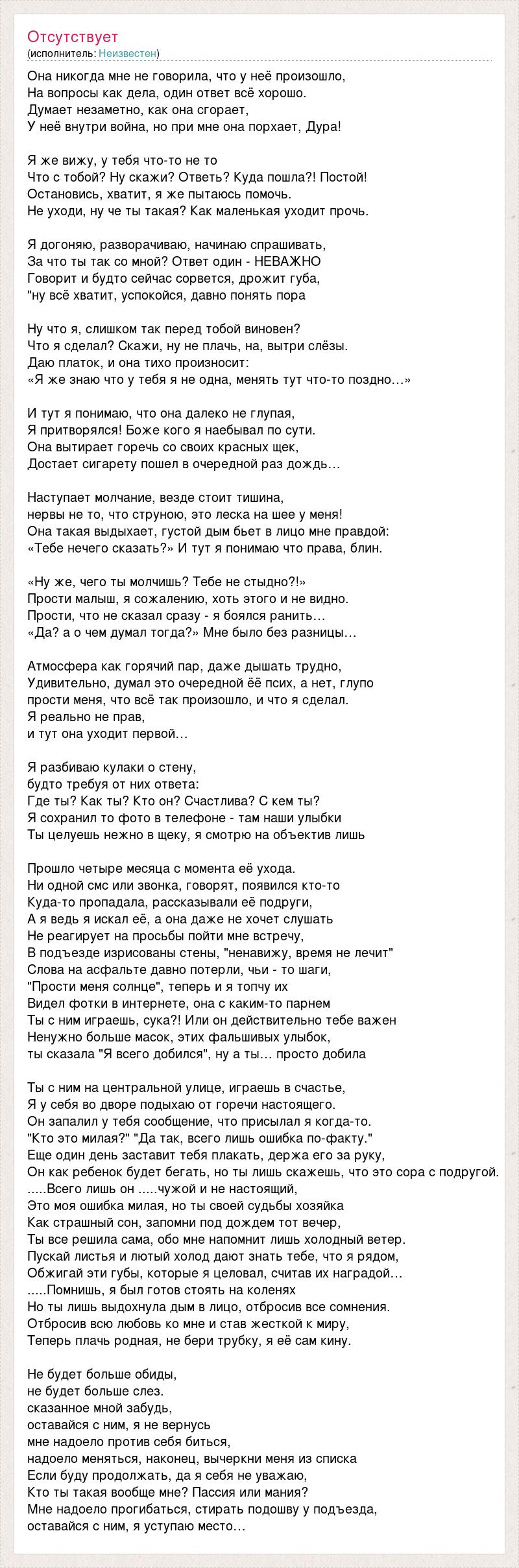 Она никогда мне не говорила, что у неё произошло, На вопросы как дела, один ответ всё хорошо. Думает незаметно, как она сгорает, У неё внутри война, но при мне она порхает, Дура! Я же вижу, у тебя что-то не то Что с тобой? Ну скажи? Ответь? Куда пошла?! Постой! Остановись, хватит, я же пытаюсь помочь. Не уходи, ну че ты такая? Как маленькая уходит прочь. Я догоняю, разворачиваю, начинаю спрашивать, За что ты так со мной? Ответ один - НЕВАЖНО Говорит и будто сейчас сорвется, дрожит губа, "ну всё хватит, успокойся, давно понять пора Ну что я, слишком так перед тобой виновен? Что я сделал? Скажи, ну не плачь, на, вытри слёзы. Даю платок, и она тихо произносит: «Я же знаю что у тебя я не одна, менять тут что-то поздно…» И тут я понимаю, что она далеко не глупая, Я притворялся! Боже кого я наебывал по сути. Она вытирает горечь со своих красных щек, Достает сигарету пошел в очередной раз дождь… Наступает молчание, везде стоит тишина, нервы не то, что струною, это леска на шее у меня! Она такая выдыхает, густой дым бьет в лицо мне правдой: «Тебе нечего сказать?» И тут я понимаю что права, блин. «Ну же, чего ты молчишь? Тебе не стыдно?!» Прости малыш, я сожалению, хоть этого и не видно. Прости, что не сказал сразу - я боялся ранить… «Да? а о чем думал тогда?» Мне было без разницы… Атмосфера как горячий пар, даже дышать трудно, Удивительно, думал это очередной ёё псих, а нет, глупо прости меня, что всё так произошло, и что я сделал. Я реально не прав, и тут она уходит первой… Я разбиваю кулаки о стену, будто требуя от них ответа: Где ты? Как ты? Кто он? Счастлива? С кем ты? Я сохранил то фото в телефоне - там наши улыбки Ты целуешь нежно в щеку, я смотрю на объектив лишь Прошло четыре месяца с момента её ухода. Ни одной смс или звонка, говорят, появился кто-то Куда-то пропадала, рассказывали её подруги, А я ведь я искал её, а она даже не хочет слушать Не реагирует на просьбы пойти мне встречу, В подъезде изрисованы стены, "ненавижу, время не лечит" Слова на асфальте давно потерли, чьи - то шаги, "Прости меня солнце", теперь и я топчу их Видел фотки в интернете, она с каким-то парнем Ты с ним играешь, сука?! Или он действительно тебе важен Ненужно больше масок, этих фальшивых улыбок, ты сказала "Я всего добился", ну а ты… просто добила Ты с ним на центральной улице, играешь в счастье, Я у себя во дворе подыхаю от горечи настоящего. Он запалил у тебя сообщение, что присылал я когда-то. "Кто это милая?" "Да так, всего лишь ошибка по-факту." Еще один день заставит тебя плакать, держа его за руку, Он как ребенок будет бегать, но ты лишь скажешь, что это сора с подругой. .....Всего лишь он .....чужой и не настоящий, Это моя ошибка милая, но ты своей судьбы хозяйка Как страшный сон, запомни под дождем тот вечер, Ты все решила сама, обо мне напомнит лишь холодный ветер. Пускай листья и лютый холод дают знать тебе, что я рядом, Обжигай эти губы, которые я целовал, считав их наградой… .....Помнишь, я был готов стоять на коленях Но ты лишь выдохнула дым в лицо, отбросив все сомнения. Отбросив всю любовь ко мне и став жесткой к миру, Теперь плачь родная, не бери трубку, я её сам кину. Не будет больше обиды, не будет больше слез. сказанное мной забудь, оставайся с ним, я не вернусь мне надоело против себя биться, надоело меняться, наконец, вычеркни меня из списка Если буду продолжать, да я себя не уважаю, Кто ты такая вообще мне? Пассия или мания?