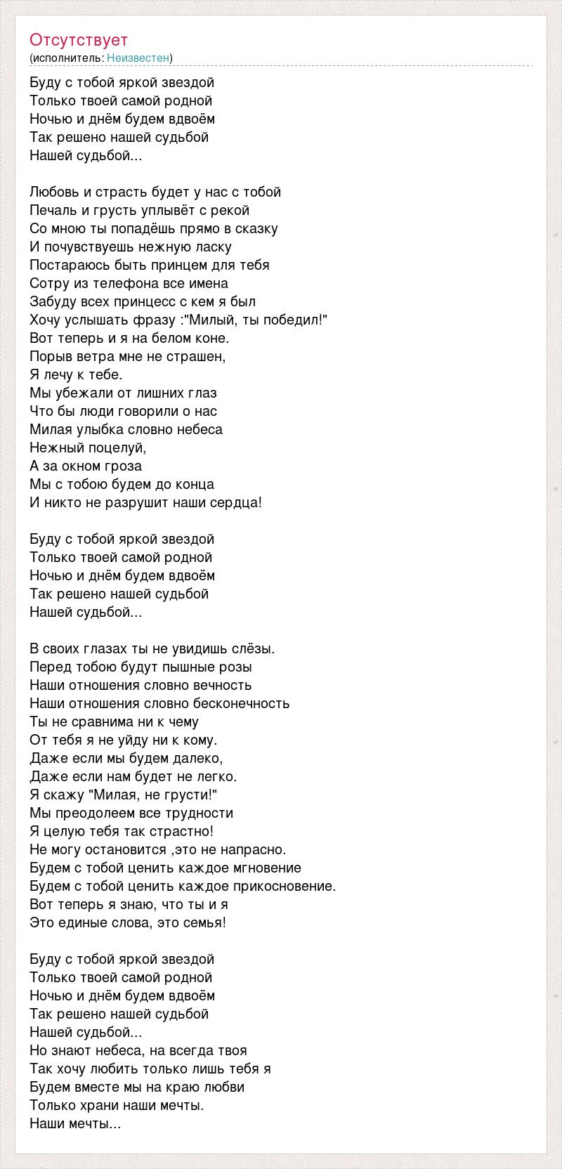 Буду с тобой яркой звездой Только твоей самой родной Ночью и днём будем вдвоём Так решено нашей судьбой Нашей судьбой... Любовь и страсть будет у нас с тобой Печаль и грусть уплывёт с рекой Со мною ты попадёшь прямо в сказку И почувствуешь нежную ласку Постараюсь быть принцем для тебя Сотру из телефона все имена Забуду всех принцесс с кем я был Хочу услышать фразу :"Милый, ты победил!" Вот теперь и я на белом коне. Порыв ветра мне не страшен, Я лечу к тебе. Мы убежали от лишних глаз Что бы люди говорили о нас Милая улыбка словно небеса Нежный поцелуй, А за окном гроза Мы с тобою будем до конца И никто не разрушит наши сердца! Буду с тобой яркой звездой Только твоей самой родной Ночью и днём будем вдвоём Так решено нашей судьбой Нашей судьбой... В своих глазах ты не увидишь слёзы. Перед тобою будут пышные розы Наши отношения словно вечность Наши отношения словно бесконечность Ты не сравнима ни к чему От тебя я не уйду ни к кому. Даже если мы будем далеко, Даже если нам будет не легко. Я скажу "Милая, не грусти!" Мы преодолеем все трудности Я целую тебя так страстно! Не могу остановится ,это не напрасно. Будем с тобой ценить каждое мгновение Будем с тобой ценить каждое прикосновение. Вот теперь я знаю, что ты и я Это единые слова, это семья! Буду с тобой яркой звездой Только твоей самой родной Ночью и днём будем вдвоём Так решено нашей судьбой Нашей судьбой... Но знают небеса, на всегда твоя Так хочу любить только лишь тебя я Будем вместе мы на краю любви Только храни наши мечты. Наши мечты...
