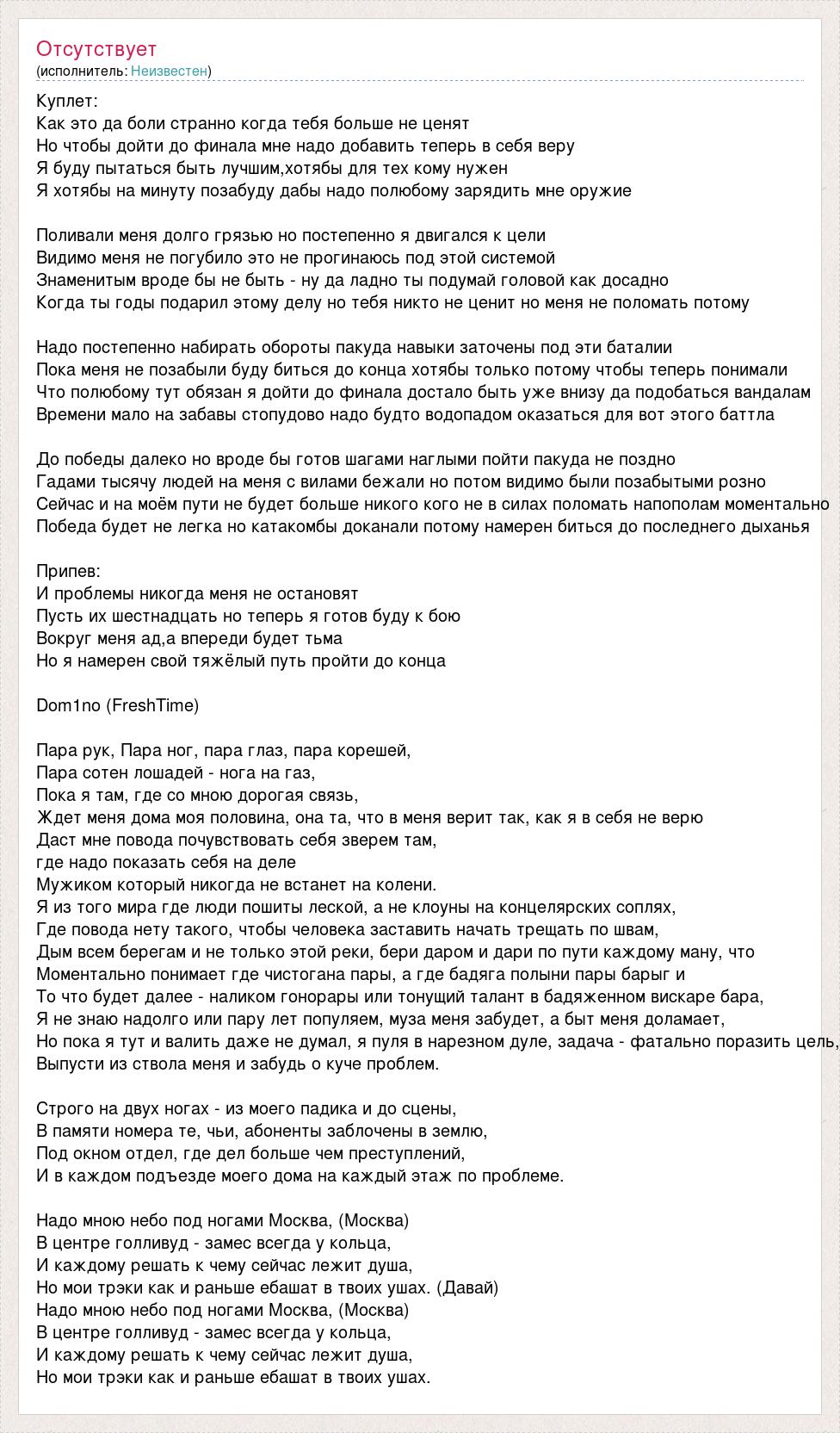 Куплет: Как это да боли странно когда тебя больше не ценят Но чтобы дойти до финала мне надо добавить теперь в себя веру Я буду пытаться быть лучшим,хотябы для тех кому нужен Я хотябы на минуту позабуду дабы надо полюбому зарядить мне оружие Поливали меня долго грязью но постепенно я двигался к цели Видимо меня не погубило это не прогинаюсь под этой системой Знаменитым вроде бы не быть - ну да ладно ты подумай головой как досадно Когда ты годы подарил этому делу но тебя никто не ценит но меня не поломать потому Надо постепенно набирать обороты пакуда навыки заточены под эти баталии Пока меня не позабыли буду биться до конца хотябы только потому чтобы теперь понимали Что полюбому тут обязан я дойти до финала достало быть уже внизу да подобаться вандалам Времени мало на забавы стопудово надо будто водопадом оказаться для вот этого баттла До победы далеко но вроде бы готов шагами наглыми пойти пакуда не поздно Гадами тысячу людей на меня с вилами бежали но потом видимо были позабытыми розно Сейчас и на моём пути не будет больше никого кого не в силах поломать напополам моментально Победа будет не легка но катакомбы доканали потому намерен биться до последнего дыханья Припев: И проблемы никогда меня не остановят Пусть их шестнадцать но теперь я готов буду к бою Вокруг меня ад,а впереди будет тьма Но я намерен свой тяжёлый путь пройти до конца Dom1no (FreshTime) Пара рук, Пара ног, пара глаз, пара корешей, Пара сотен лошадей - нога на газ, Пока я там, где со мною дорогая связь, Ждет меня дома моя половина, она та, что в меня верит так, как я в себя не верю Даст мне повода почувствовать себя зверем там, где надо показать себя на деле Мужиком который никогда не встанет на колени. Я из того мира где люди пошиты леской, а не клоуны на концелярских соплях, Где повода нету такого, чтобы человека заставить начать трещать по швам, Дым всем берегам и не только этой реки, бери даром и дари по пути каждому ману, что Моментально понимает где чистогана пары, а где бадяга полыни пары барыг и То что будет далее - наликом гонорары или тонущий талант в бадяженном вискаре бара, Я не знаю надолго или пару лет популяем, муза меня забудет, а быт меня доламает, Но пока я тут и валить даже не думал, я пуля в нарезном дуле, задача - фатально поразить цель, Выпусти из ствола меня и забудь о куче проблем. Строго на двух ногах - из моего падика и до сцены, В памяти номера те, чьи, абоненты заблочены в землю, Под окном отдел, где дел больше чем преступлений, И в каждом подъезде моего дома на каждый этаж по проблеме. Надо мною небо под ногами Москва, (Москва) В центре голливуд - замес всегда у кольца, И каждому решать к чему сейчас лежит душа, Но мои трэки как и раньше ебашат в твоих ушах. (Давай) Надо мною небо под ногами Москва, (Москва) В центре голливуд - замес всегда у кольца, И каждому решать к чему сейчас лежит душа, Но мои трэки как и раньше ебашат в твоих ушах.