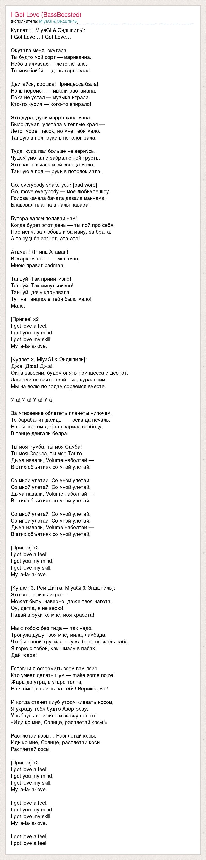 Куплет 1, MiyaGi & Эндшпиль]: I Got Love… I Got Love… Окутала меня, окутала. Ты будто мой сорт — мариванна. Небо в алмазах — лето летало. Ты моя бэйби — дочь карнавала. Двигайся, крошка! Принцесса бала! Ночь перемен — мысли растамана. Пока не устал — музыка играла. Кто-то курил — кого-то впирало! Это дура, дури марра хана мана. Было думал, улетала в теплые края — Лето, море, песок, но мне тебя мало. Танцую в пол, руки в потолок зала. Туда, куда пал больше не вернусь. Чудом умотал и забрал с ней грусть. Это наша жизнь и ей всегда мало. Танцую в пол — руки в потолок зала. Go, everybody shake your [bad word] Go, move everybody — мое любимое шоу. Голова качала бачата давала маннама. Блавовал планна в налы навара. Бутора валом подавай нам! Когда будет этот день — ты пой про себя, Про меня, за любовь и за маму, за брата, А то судьба загнет, ата-ата! Атаман! Я типа Атаман! В жарком танго — меломан, Мною правит badman. Танцуй! Так примитивно! Танцуй! Так импульсивно! Танцуй, дочь карнавала. Тут на танцполе тебя было мало! Мало. [Припев] x2 I got love а feel. I got you my mind. I got love my skill. My la-la-la-love. [Куплет 2, MiyaGi & Эндшпиль]: Джа! Джа! Джа! Окна завесим, будем опять принцесса и деспот. Лаврами не взять твой пыл, куралесим. Мы на волю по годам сорвемся вместе. У-а! У-а! У-а! У-а! За мгновение облететь планеты нипочем, То барабанит дождь — тоска да печаль. Но ты светом добра озарила свободу, В танце двигали бёдра. Ты моя Румба, ты моя Самба! Ты моя Сальса, ты мое Танго. Дыма навали, Volume наболтай — В этих объятиях со мной улетай. Со мной улетай. Со мной улетай. Со мной улетай. Со мной улетай. Дыма навали, Volume наболтай — В этих объятиях со мной улетай. Со мной улетай. Со мной улетай. Со мной улетай. Со мной улетай. Дыма навали, Volume наболтай — В этих объятиях со мной улетай. [Припев] x2 I got love а feel. I got you my mind. I got love my skill. My la-la-la-love. [Куплет 3, Рем Дигга, MiyaGi & Эндшпиль]: Это всего лишь игра — Может быть, наверно, даже твоя нагота. Оу, детка, я не верю! Падай в руки ко мне, моя красота! Мы с тобою без гида — так надо, Тронула душу твоя мне, мила, ламбада. Чтобы попой крутила — yes, beat, не жаль саба. Я горю с тобой, как шмаль в пабах! Дай жара! Готовый я оформить всем вам лойс, Кто умеет делать шум — make some noize! Жара до утра, в угаре толпа, Но я смотрю лишь на тебя! Веришь, ма? И когда станет клуб утром клевать носом, Я украду тебя будто Азор розу. Улыбнусь в тишине и скажу просто: «Иди ко мне, Солнце, расплетай косы!» Расплетай косы… Расплетай косы. Иди ко мне, Солнце, расплетай косы. Расплетай косы. [Припев] x2 I got love а feel. I got you my mind. I got love my skill. My la-la-la-love. I got love а feel. I got you my mind. I got love my skill. My la-la-la-love. I got love a feel! I got love a feel!