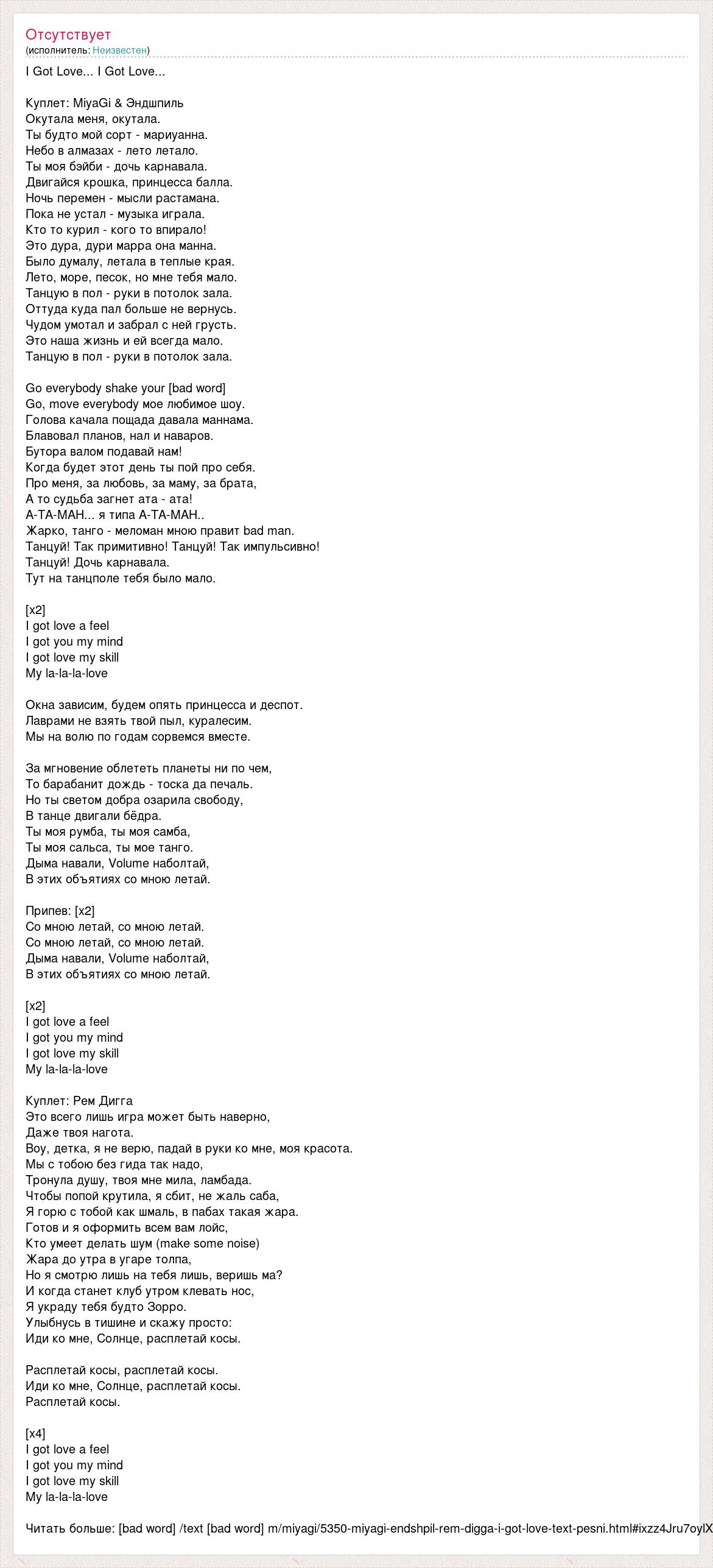 I Got Love... I Got Love... Куплет: MiyaGi & Эндшпиль Окутала меня, окутала. Ты будто мой сорт - мариуанна. Небо в алмазах - лето летало. Ты моя бэйби - дочь карнавала. Двигайся крошка, принцесса балла. Ночь перемен - мысли растамана. Пока не устал - музыка играла. Кто то курил - кого то впирало! Это дура, дури марра она манна. Было думалу, летала в теплые края. Лето, море, песок, но мне тебя мало. Танцую в пол - руки в потолок зала. Оттуда куда пал больше не вернусь. Чудом умотал и забрал с ней грусть. Это наша жизнь и ей всегда мало. Танцую в пол - руки в потолок зала. Go everybody shake your [bad word] Go, move everybody мое любимое шоу. Голова качала пощада давала маннама. Блавовал планов, нал и наваров. Бутора валом подавай нам! Когда будет этот день ты пой про себя. Про меня, за любовь, за маму, за брата, А то судьба загнет ата - ата! А-ТА-МАН... я типа А-ТА-МАН.. Жарко, танго - меломан мною правит bad man. Танцуй! Так примитивно! Танцуй! Так импульсивно! Танцуй! Дочь карнавала. Тут на танцполе тебя было мало. [x2] I got love a feel I got you my mind I got love my skill My la-la-la-love Окна зависим, будем опять принцесса и деспот. Лаврами не взять твой пыл, куралесим. Мы на волю по годам сорвемся вместе. За мгновение облететь планеты ни по чем, То барабанит дождь - тоска да печаль. Но ты светом добра озарила свободу, В танце двигали бёдра. Ты моя румба, ты моя самба, Ты моя сальса, ты мое танго. Дыма навали, Volume наболтай, В этих объятиях со мною летай. Припев: [х2] Со мною летай, со мною летай. Со мною летай, со мною летай. Дыма навали, Volume наболтай, В этих объятиях со мною летай. [х2] I got love a feel I got you my mind I got love my skill My la-la-la-love Куплет: Рем Дигга Это всего лишь игра может быть наверно, Даже твоя нагота. Воу, детка, я не верю, падай в руки ко мне, моя красота. Мы с тобою без гида так надо, Тронула душу, твоя мне мила, ламбада. Чтобы попой крутила, я сбит, не жаль саба, Я горю с тобой как шмаль, в пабах такая жара. Готов и я оформить всем вам лойс, Кто умеет делать шум (make some noise) Жара до утра в угаре толпа, Но я смотрю лишь на тебя лишь, веришь ма? И когда станет клуб утром клевать нос, Я украду тебя будто Зорро. Улыбнусь в тишине и скажу просто: Иди ко мне, Солнце, расплетай косы. Расплетай косы, расплетай косы. Иди ко мне, Солнце, расплетай косы. Расплетай косы. [x4] I got love a feel I got you my mind I got love my skill My la-la-la-love Читать больше: [bad word] /text [bad word] m/miyagi/5350-miyagi-endshpil-rem-digga-i-got-love-text-pesni.html#ixzz4Jru7oylX
