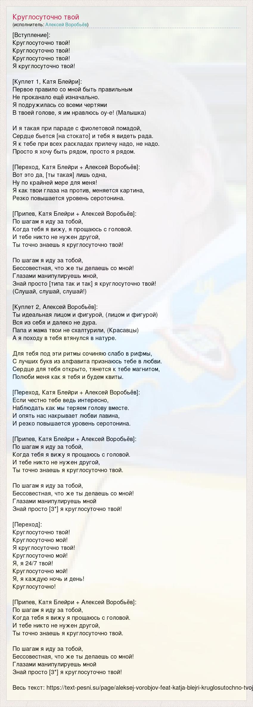 [Вступление]: Круглосуточно твой! Круглосуточно твой! Круглосуточно твой! Я круглосуточно твой! [Куплет 1, Катя Блейри]: Первое правило со мной быть правильным Не проканало ещё изначально. Я подружилась со всеми чертями В твоей голове, я им нравлюсь оу-е! (Малышка) И я такая при параде с фиолетовой помадой, Сердце бьется [на стокато] и тебя я видеть рада. Я к тебе при всех раскладах прилечу надо, не надо. Просто я хочу быть рядом, просто я рядом. [Переход, Катя Блейри + Алексей Воробьёв]: Вот это да, [ты такая] лишь одна, Ну по крайней мере для меня! Я как твои глаза на против, меняется картина, Резко повышается уровень серотонина. [Припев, Катя Блейри + Алексей Воробьёв]: По шагам я иду за тобой, Когда тебя я вижу, я прощаюсь с головой. И тебе никто не нужен другой, Ты точно знаешь я круглосуточно твой! По шагам я иду за тобой, Бессовестная, что же ты делаешь со мной! Глазами манипулируешь мной, Знай просто [типа так и так] я круглосуточно твой! (Слушай, слушай, слушай!) [Куплет 2, Алексей Воробьёв]: Ты идеальная лицом и фигурой, (лицом и фигурой) Вся из себя и далеко не дура. Папа и мама твои не схалтурили, (Красавцы) А я походу в тебя втянулся в натуре. Для тебя под эти ритмы сочиняю слабо в рифмы, С лучших букв из алфавита признаюсь тебе в любви. Сердце для тебя открыто, тянется к тебе магнитом, Полюби меня как я тебя и будем квиты. [Переход, Катя Блейри + Алексей Воробьёв]: Если честно тебе ведь интересно, Наблюдать как мы теряем голову вместе. И опять нас накрывает любви лавина, И резко повышается уровень серотонина. [Припев, Катя Блейри + Алексей Воробьёв]: По шагам я иду за тобой, Когда тебя я вижу я прощаюсь с головой. И тебе никто не нужен другой, Ты точно знаешь я круглосуточно твой. По шагам я иду за тобой, Бессовестная, что же ты делаешь со мной! Глазами манипулируешь мной Знай просто [3*] я круглосуточно твой! [Переход]: Круглосуточно твой! Круглосуточно мой! Я круглосуточно твой! Круглосуточно мой! Я, я 24/7 твой! Круглосуточно мой! Я, я каждую ночь и день! Круглосуточно! [Припев, Катя Блейри + Алексей Воробьёв]: По шагам я иду за тобой, Когда тебя я вижу я прощаюсь с головой. И тебе никто не нужен другой, Ты точно знаешь я круглосуточно твой. По шагам я иду за тобой, Бессовестная, что же ты делаешь со мной! Глазами манипулируешь мной Знай просто [3*] я круглосуточно твой! Весь текст: https://text-pesni.su/page/aleksej-vorobjov-feat-katja-blejri-kruglosutochno-tvoj