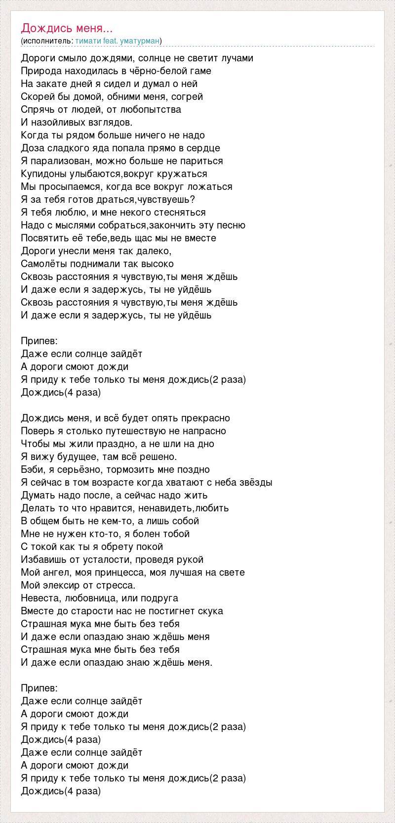 Дороги смыло дождями, солнце не светит лучами Природа находилась в чёрно-белой гаме На закате дней я сидел и думал о ней Скорей бы домой, обними меня, согрей Спрячь от людей, от любопытства И назойливых взглядов. Когда ты рядом больше ничего не надо Доза сладкого яда попала прямо в сердце Я парализован, можно больше не париться Купидоны улыбаются,вокруг кружаться Мы просыпаемся, когда все вокруг ложаться Я за тебя готов драться,чувствуешь? Я тебя люблю, и мне некого стесняться Надо с мыслями собраться,закончить эту песню Посвятить её тебе,ведь щас мы не вместе Дороги унесли меня так далеко, Самолёты поднимали так высоко Сквозь расстояния я чувствую,ты меня ждёшь И даже если я задержусь, ты не уйдёшь Сквозь расстояния я чувствую,ты меня ждёшь И даже если я задержусь, ты не уйдёшь Припев: Даже если солнце зайдёт А дороги смоют дожди Я приду к тебе только ты меня дождись(2 раза) Дождись(4 раза) Дождись меня, и всё будет опять прекрасно Поверь я столько путешествую не напрасно Чтобы мы жили праздно, а не шли на дно Я вижу будущее, там всё решено. Бэби, я серьёзно, тормозить мне поздно Я сейчас в том возрасте когда хватают с неба звёзды Думать надо после, а сейчас надо жить Делать то что нравится, ненавидеть,любить В общем быть не кем-то, а лишь собой Мне не нужен кто-то, я болен тобой С токой как ты я обрету покой Избавишь от усталости, проведя рукой Мой ангел, моя принцесса, моя лучшая на свете Мой элексир от стресса. Невеста, любовница, или подруга Вместе до старости нас не постигнет скука Страшная мука мне быть без тебя И даже если опаздаю знаю ждёшь меня Страшная мука мне быть без тебя И даже если опаздаю знаю ждёшь меня. Припев: Даже если солнце зайдёт А дороги смоют дожди Я приду к тебе только ты меня дождись(2 раза) Дождись(4 раза) Даже если солнце зайдёт А дороги смоют дожди Я приду к тебе только ты меня дождись(2 раза) Дождись(4 раза)