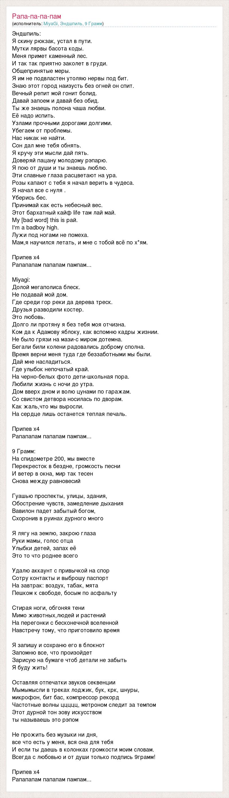 Эндшпиль: Я скину рюкзак, устал в пути. Мутки лярвы басота коды. Меня примет каменный лес. И так так приятно заколет в груди. Общепринятые меры. Я им не подвластен утоляю нервы под бит. Знаю этот город наизусть без огней он спит. Вечный репит мой гонит болид. Давай запоем и давай без обид. Ты же знаешь полона чаша любви. Её надо испить. Узлами прочными дорогами долгими. Убегаем от проблемы. Нас никак не найти. Сон дал мне тебя обнять. Я кручу эти мысли дай пять. Доверяй пацану молодому рэпарю. Я пою от души и ты знаешь люблю. Эти славные глаза расцветают на ура. Розы капают с тебя я начал верить в чудеса. Я начал все с нуля . Уберись бес. Принимай как есть небесный вес. Этот бархатный кайф life там лай май. My [bad word] this is рай. I'm a badboy high. Лужи под ногами не помеха. Мам,я научился летать, и мне с тобой всё по х*ям. Припев x4 Рапапапам папапам пампам... Miyagi: Долой мегаполиса блеск. Не подавай мой дом. Где среди гор реки да дерева треск. Друзья разводили костер. Это любовь. Долго ли протяну я без тебя моя отчизна. Ком да к Адамову яблоку, как вспомню кадры жизнии. Не было грязи на мази-с миром дотемна. Бегали били колени радовались доброму сполна. Время верни меня туда где беззаботными мы были. Дай мне насладиться. Где улыбок непочатый край. На черно-белых фото дети-школьная пора. Любили жизнь с ночи до утра. Дом вверх дном и волю цунами по гаражам. Со свистом детвора носилась по дворам. Как жаль,что мы выросли. На сердце лишь останется теплая печаль. Припев x4 Рапапапам папапам пампам... 9 Грамм: На спидометре 200, мы вместе Перекресток в бездне, громкость песни И ветер в окна, мир так тесен Снова между равновесий Гуашью проспекты, улицы, здания, Обострение чувств, замедление дыхания Вавилон падет забытый богом, Схоронив в руинах дурного много Я лягу на землю, закрою глаза Руки мамы, голос отца Улыбки детей, запах её Это то что роднее всего Удалю аккаунт с привычкой на спор Сотру контакты и выброшу паспорт На завтрак: воздух, табак, мята Пешком к свободе, босым по асфальту Стирая ноги, обгоняя тени Мимо животных,людей и растений На перегонки с бесконечной вселенной Навстречу тому, что приготовило время Я запишу и сохраню его в блокнот Запомню все, что произойдет Зарисую на бумаге чтоб детали не забыть Я буду жить! Оставляя отпечатки звуков секвенции Мымымысли в треках лоджик, бук, крк, шнуры, микрофон, бит бас, компрессор рекорд Частотные волны ццццц, метроном следит за темпом Этот дурной тон зову искусством ты называешь это рэпом Не прожить без музыки ни дня, все что есть у меня, вся она для тебя И если ты даешь в колонках громкости моим словам. Всегда с любовью и от души только подпись 9грамм! Припев x4 Рапапапам папапам пампам...