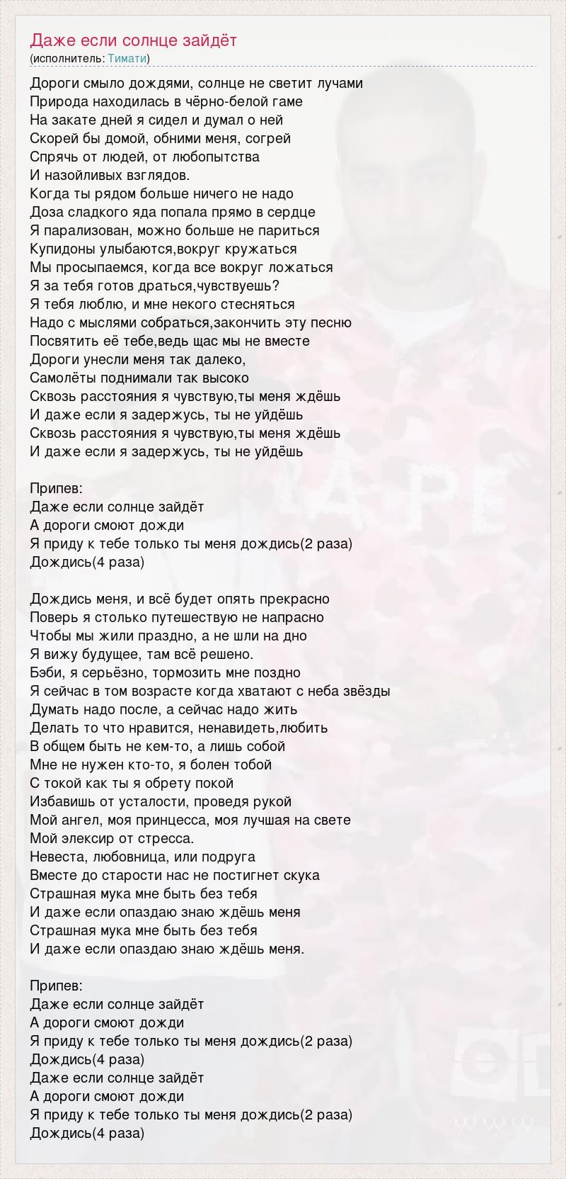 Дороги смыло дождями, солнце не светит лучами Природа находилась в чёрно-белой гаме На закате дней я сидел и думал о ней Скорей бы домой, обними меня, согрей Спрячь от людей, от любопытства И назойливых взглядов. Когда ты рядом больше ничего не надо Доза сладкого яда попала прямо в сердце Я парализован, можно больше не париться Купидоны улыбаются,вокруг кружаться Мы просыпаемся, когда все вокруг ложаться Я за тебя готов драться,чувствуешь? Я тебя люблю, и мне некого стесняться Надо с мыслями собраться,закончить эту песню Посвятить её тебе,ведь щас мы не вместе Дороги унесли меня так далеко, Самолёты поднимали так высоко Сквозь расстояния я чувствую,ты меня ждёшь И даже если я задержусь, ты не уйдёшь Сквозь расстояния я чувствую,ты меня ждёшь И даже если я задержусь, ты не уйдёшь Припев: Даже если солнце зайдёт А дороги смоют дожди Я приду к тебе только ты меня дождись(2 раза) Дождись(4 раза) Дождись меня, и всё будет опять прекрасно Поверь я столько путешествую не напрасно Чтобы мы жили праздно, а не шли на дно Я вижу будущее, там всё решено. Бэби, я серьёзно, тормозить мне поздно Я сейчас в том возрасте когда хватают с неба звёзды Думать надо после, а сейчас надо жить Делать то что нравится, ненавидеть,любить В общем быть не кем-то, а лишь собой Мне не нужен кто-то, я болен тобой С токой как ты я обрету покой Избавишь от усталости, проведя рукой Мой ангел, моя принцесса, моя лучшая на свете Мой элексир от стресса. Невеста, любовница, или подруга Вместе до старости нас не постигнет скука Страшная мука мне быть без тебя И даже если опаздаю знаю ждёшь меня Страшная мука мне быть без тебя И даже если опаздаю знаю ждёшь меня. Припев: Даже если солнце зайдёт А дороги смоют дожди Я приду к тебе только ты меня дождись(2 раза) Дождись(4 раза) Даже если солнце зайдёт А дороги смоют дожди Я приду к тебе только ты меня дождись(2 раза) Дождись(4 раза)