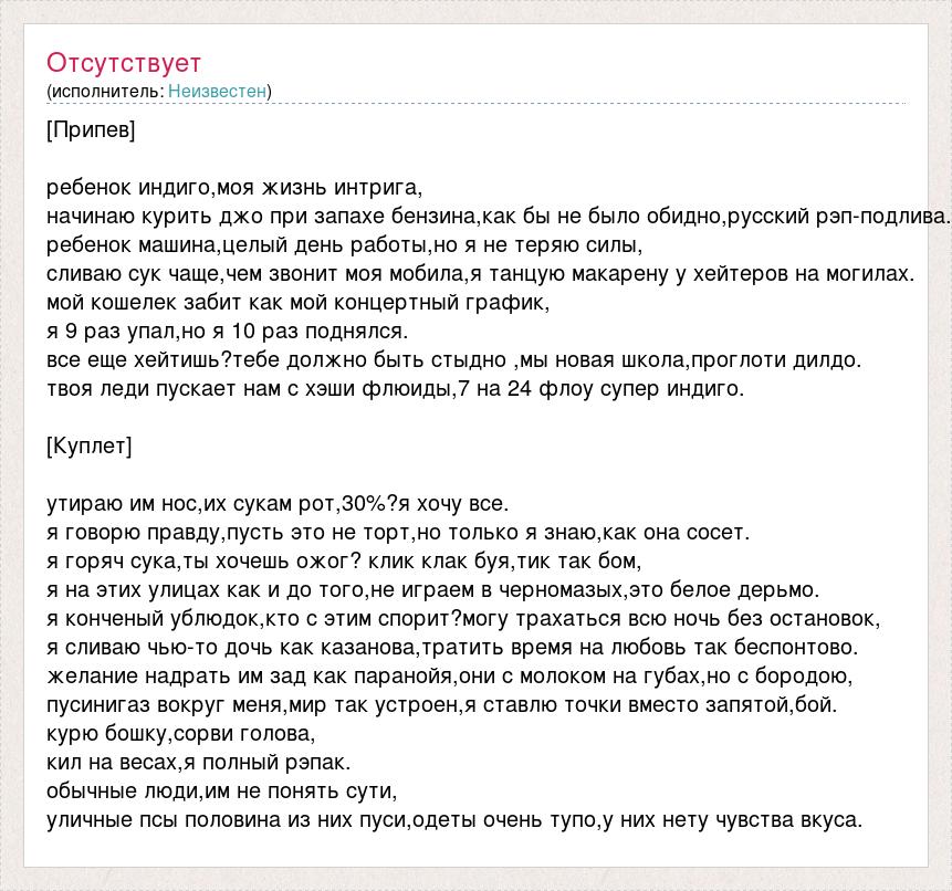 [Припев] ребенок индиго,моя жизнь интрига, начинаю курить джо при запахе бензина,как бы не было обидно,русский рэп-подлива. ребенок машина,целый день работы,но я не теряю силы, сливаю сук чаще,чем звонит моя мобила,я танцую макарену у хейтеров на могилах. мой кошелек забит как мой концертный график, я 9 раз упал,но я 10 раз поднялся. все еще хейтишь?тебе должно быть стыдно ,мы новая школа,проглоти дилдо. твоя леди пускает нам с хэши флюиды,7 на 24 флоу супер индиго. [Куплет] утираю им нос,их сукам рот,30%?я хочу все. я говорю правду,пусть это не торт,но только я знаю,как она сосет. я горяч сука,ты хочешь ожог? клик клак буя,тик так бом, я на этих улицах как и до того,не играем в черномазых,это белое дерьмо. я конченый ублюдок,кто с этим спорит?могу трахаться всю ночь без остановок, я сливаю чью-то дочь как казанова,тратить время на любовь так беспонтово. желание надрать им зад как паранойя,они с молоком на губах,но с бородою, пусинигаз вокруг меня,мир так устроен,я ставлю точки вместо запятой,бой. курю бошку,сорви голова, кил на весах,я полный рэпак. обычные люди,им не понять сути, уличные псы половина из них пуси,одеты очень тупо,у них нету чувства вкуса.