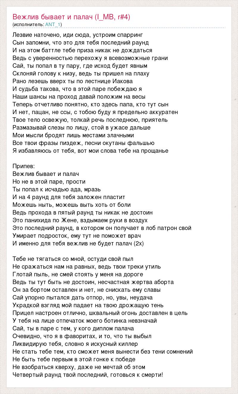 Лезвие наточено, иди сюда, устроим спарринг Сын запомни, что это для тебя последний раунд И на этом баттле тебе приза никак не дождаться Ведь с уверенностью перехожу я всевозможные грани Сай, ты попал в ту пару, где исход будет явным Склоняй голову к низу, ведь ты пришел на плаху Рано лезешь вверх ты по лестнице Иакова И судьба такова, что в этой паре побеждаю я Наши шансы на проход давай положим на весы Теперь отчетливо понятно, кто здесь папа, кто тут сын И нет, пацан, не ссы, с тобою буду я предельно аккуратен Твое тело освежую, толкай речь последнюю, приятель Размазывай слезы по лицу, стой в ужасе дальше Мои мысли бродят лишь местами злачными Все твои фразы пиздеж, песни окутаны фальшью Я избавляюсь от тебя, вот мои слова тебе на прощанье Припев: Вежлив бывает и палач Но не в этой паре, прости Ты попал к исчадью ада, мразь И на 4 раунд для тебя заложен пластит Можешь ныть, можешь выть хоть от боли Ведь прохода в пятый раунд ты никак не достоин Это панихида по Жене, вздымаем руки в воздух Это последний раунд, в котором он получает в лоб патрон свой Умирает подросток, ему тут не поможет врач И именно для тебя вежлив не будет палач (2х) Тебе не тягаться со мной, остуди свой пыл Не сражаться нам на равных, ведь твои треки утиль Глотай пыль, не смей стоять у меня на дороге Ведь ты тут быть не достоин, несчастная жертва аборта Он за бортом оставлен и нет, не снискать ему славы Сай упорно пытался дать отпор, но, увы, неудача Украдкой взгляд мой падает на твою дрожащую тень Прицел настроен отлично, шквальный огонь доставлен в цель У тебя на лице отпечаток моего ботинка невзначай Сай, ты в паре с тем, у кого диплом палача Очевидно, что я в фаворитах, и то, что ты выбыл Ликвидирую тебя, словно я искусный киллер Не стать тебе тем, кто сможет меня вынести без тени сомнений Не быть тебе первым в этой гонке к победе Не взобраться кверху, даже не мечтай об этом Четвертый раунд твой последний, готовься к смерти!
