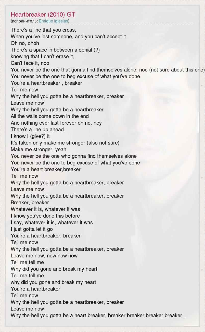 There’s a line that you cross, When you’ve lost someone, and you can’t accept it Oh no, ohoh There’s a space in between a denial (?) knowing that I can’t erase it, Can’t face it, noo You never be the one that gonna find themselves alone, noo (not sure about this one) You never be the one to beg excuse of what you’ve done You’re a heartbreaker , breaker Tell me now Why the hell you gotta be a heartbreaker, breaker Leave me now Why the hell you gotta be a heartbreaker All the walls come down in the end And nothing ever last forever oh no, hey There’s a line up ahead I know I (give?) it It’s taken only make me stronger (also not sure) Make me stronger, yeah You never be the one who gonna find themselves alone You never be the one to beg excuse of what you’ve done You’re a heart breaker,breaker Tell me now Why the hell you gotta be a heartbreaker, breaker Leave me now Why the hell you gotta be a heartbreaker, breaker Breaker, breaker Whatever it is, whatever it was I know you’ve done this before I say, whatever it is, whatever it was I just gotta let it go You’re a heartbreaker, breaker Tell me now Why the hell you gotta be a heartbreaker, breaker Leave me now, now now now Tell me tell me Why did you gone and break my heart Tell me tell me why did you gone and break my heart You’re a heartbreaker Tell me now Why the hell you gotta be a heartbreaker, breaker Leave me now Why the hell you gotta be a heart breaker, breaker breaker breaker breaker..