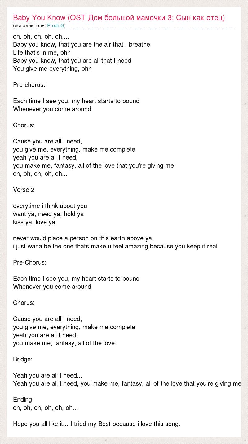 oh, oh, oh, oh, oh.... Baby you know, that you are the air that I breathe Life that's in me, ohh Baby you know, that you are all that I need You give me everything, ohh Pre-chorus: Each time I see you, my heart starts to pound Whenever you come around Chorus: Cause you are all I need, you give me, everything, make me complete yeah you are all I need, you make me, fantasy, all of the love that you're giving me oh, oh, oh, oh, oh... Verse 2 everytime i think about you want ya, need ya, hold ya kiss ya, love ya never would place a person on this earth above ya i just wana be the one thats make u feel amazing because you keep it real Pre-Chorus: Each time I see you, my heart starts to pound Whenever you come around Chorus: Cause you are all I need, you give me, everything, make me complete yeah you are all I need, you make me, fantasy, all of the love Bridge: Yeah you are all I need... Yeah you are all I need, you make me, fantasy, all of the love that you're giving me Ending: oh, oh, oh, oh, oh, oh... Hope you all like it... I tried my Best because i love this song.