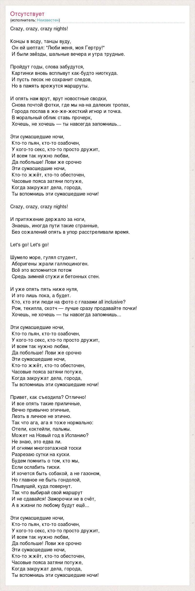 Crazy, crazy, crazy nights! Концы в воду, танцы вуду, Он ей шептал: "Люби меня, моя Гертру!" И были звёзды, шальные вечера и утра трудные. Пройдут годы, слова забудутся, Картинки вновь всплывут как-будто ниоткуда. И пусть песок не сохранит следов, Но в память врежутся маршруты. И опять нам врут, врут новостные сводки, Снова почтой фотки, где мы на-на далеких тропах, Города послав в же-же-жесткий игнор и точка. В моральный облик ставь прочерк, Хочешь, не хочешь — ты навсегда запомнишь... Эти сумасшедшие ночи, Кто-то пьян, кто-то озабочен, У кого-то секс, кто-то просто дружит, И всем так нужно любви, Да побольше! Лови же срочно Эти сумасшедшие ночи, Кто-то жжёт, кто-то обесточен, Часовые пояса затяни потуже, Когда закружат дела, города, Ты вспомнишь эти сумасшедшие ночи! Crazy, crazy, crazy nights! И притяжение держало за ноги, Знаешь, иногда пути такие странные, Без сожалений опять в упор расстреливали время. Let's go! Let's go! Шумело море, гулял студент, Аборигены жрали галлюциноген. Всё это вспомнится потом Средь зимней стужи и бетонных стен. И уже опять пять ниже нуля, И это лишь пока, а будет. Кто, кто эти люди на фото с глазами all inclusive? Ром, текилла, скотч — лучше сразу продавайте почки! Хочешь, не хочешь — ты навсегда запомнишь... Эти сумасшедшие ночи, Кто-то пьян, кто-то озабочен, У кого-то секс, кто-то просто дружит, И всем так нужно любви, Да побольше! Лови же срочно Эти сумасшедшие ночи, Кто-то жжёт, кто-то обесточен, Часовые пояса затяни потуже, Когда закружат дела, города, Ты вспомнишь эти сумасшедшие ночи! Привет, как съездила? Отлично! И все опять такие приличные, Вечно привычно этичные, Лезть в личное не этично. Так что ага, ага я тоже нормально: Отели, коктейли, пальмы. Может на Новый год в Испанию? Не знаю, это едва ли. И огнями многоэтажной тоски Разрезаю сутки на куски. Будем помнить о том, кто мы, Если ослабить тиски. И хочется быть собакой, а не газоном, Но главное не быть гондолой, Плывущей, куда повернут. Так что выбирай свой маршрут И не сдавайся! Заморочки не в счёт, А в жизни по любому будут ещё... Эти сумасшедшие ночи, Кто-то пьян, кто-то озабочен, У кого-то секс, кто-то просто дружит, И всем так нужно любви, Да побольше! Лови же срочно Эти сумасшедшие ночи, Кто-то жжёт, кто-то обесточен, Часовые пояса затяни потуже, Когда закружат дела, города, Ты вспомнишь эти сумасшедшие ночи!