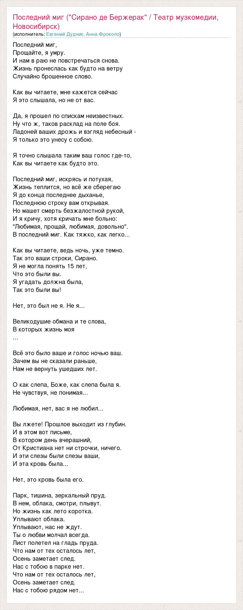 Последний миг, Прощайте, я умру. И нам в раю не повстречаться снова. Жизнь пронеслась как будто на ветру Случайно брошенное слово. Как вы читаете, мне кажется сейчас Я это слышала, но не от вас. Да, я прошел по спискам неизвестных. Ну что ж, таков расклад на поле боя. Ладоней ваших дрожь и взгляд небесный - Я только это унесу с собою. Я точно слышала таким ваш голос где-то, Как вы читаете как будто это. Последний миг, искрясь и потухая, Жизнь теплится, но всё же сберегаю Я до конца последнее дыханье, Последнюю строку вам открывая. Но машет смерть безжалостной рукой, И я кричу, хотя кричать мне больно: "Любимая, прощай, любимая, довольно". В последний миг. Как тяжко, как легко... Как вы читаете, ведь ночь, уже темно. Так это ваши строки, Сирано. Я не могла понять 15 лет, Что это были вы. Я угадать должна была, Так это были вы! Нет, это был не я. Не я... Великодушие обмана и те слова, В которых жизнь моя ... Всё это было ваше и голос ночью ваш. Зачем вы не сказали раньше, Нам не вернуть ушедших лет. О как слепа, Боже, как слепа была я. Не чувствуя, не понимая... Любимая, нет, вас я не любил... Вы лжете! Прошлое выходит из глубин. И в этом вот письме, В котором день вчерашний, От Кристиана нет ни строчки, ничего. И эти слезы были слезы ваши, И эта кровь была... Нет, это кровь была его. Парк, тишина, зеркальный пруд. В нем, облака, смотри, плывут. Но жизнь как лето коротка. Уплывают облака. Уплывают, нас не ждут. Ты о любви молчал всегда. Лист полетел на гладь пруда. Что нам от тех осталось лет, Осень заметает след. Нас с тобою в парке нет. Что нам от тех осталось лет, Осень заметает след. Нас с тобою рядом нет...