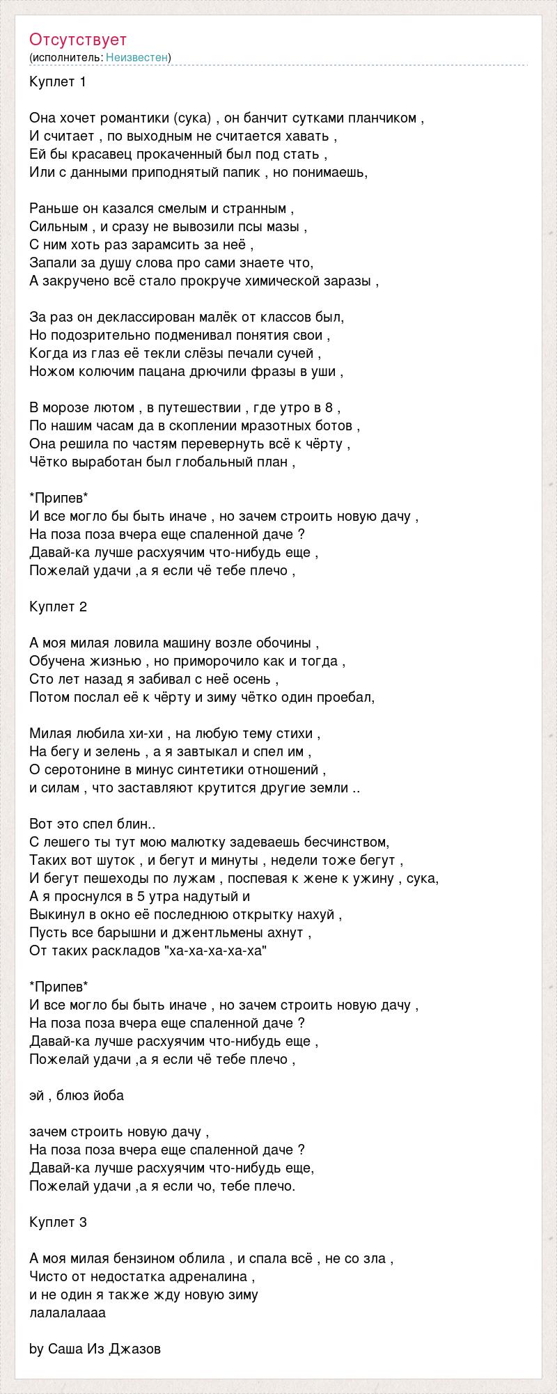 Куплет 1 Она хочет романтики (сука) , он банчит сутками планчиком , И считает , по выходным не считается хавать , Ей бы красавец прокаченный был под стать , Или с данными приподнятый папик , но понимаешь, Раньше он казался смелым и странным , Сильным , и сразу не вывозили псы мазы , С ним хоть раз зарамсить за неё , Запали за душу слова про сами знаете что, А закручено всё стало прокруче химической заразы , За раз он деклассирован малёк от классов был, Но подозрительно подменивал понятия свои , Когда из глаз её текли слёзы печали сучей , Ножом колючим пацана дрючили фразы в уши , В морозе лютом , в путешествии , где утро в 8 , По нашим часам да в скоплении мразотных ботов , Она решила по частям перевернуть всё к чёрту , Чётко выработан был глобальный план , *Припев* И все могло бы быть иначе , но зачем строить новую дачу , На поза поза вчера еще спаленной даче ? Давай-ка лучше расхуячим что-нибудь еще , Пожелай удачи ,а я если чё тебе плечо , Куплет 2 А моя милая ловила машину возле обочины , Обучена жизнью , но приморочило как и тогда , Сто лет назад я забивал с неё осень , Потом послал её к чёрту и зиму чётко один проебал, Милая любила хи-хи , на любую тему стихи , На бегу и зелень , а я завтыкал и спел им , О серотонине в минус синтетики отношений , и силам , что заставляют крутится другие земли .. Вот это спел блин.. С лешего ты тут мою малютку задеваешь бесчинством, Таких вот шуток , и бегут и минуты , недели тоже бегут , И бегут пешеходы по лужам , поспевая к жене к ужину , сука, А я проснулся в 5 утра надутый и Выкинул в окно её последнюю открытку нахуй , Пусть все барышни и джентльмены ахнут , От таких раскладов "ха-ха-ха-ха-ха" *Припев* И все могло бы быть иначе , но зачем строить новую дачу , На поза поза вчера еще спаленной даче ? Давай-ка лучше расхуячим что-нибудь еще , Пожелай удачи ,а я если чё тебе плечо , эй , блюз йоба зачем строить новую дачу , На поза поза вчера еще спаленной даче ? Давай-ка лучше расхуячим что-нибудь еще, Пожелай удачи ,а я если чо, тебе плечо. Куплет 3 А моя милая бензином облила , и спала всё , не со зла , Чисто от недостатка адреналина , и не один я также жду новую зиму лалалалааа by Саша Из Джазов