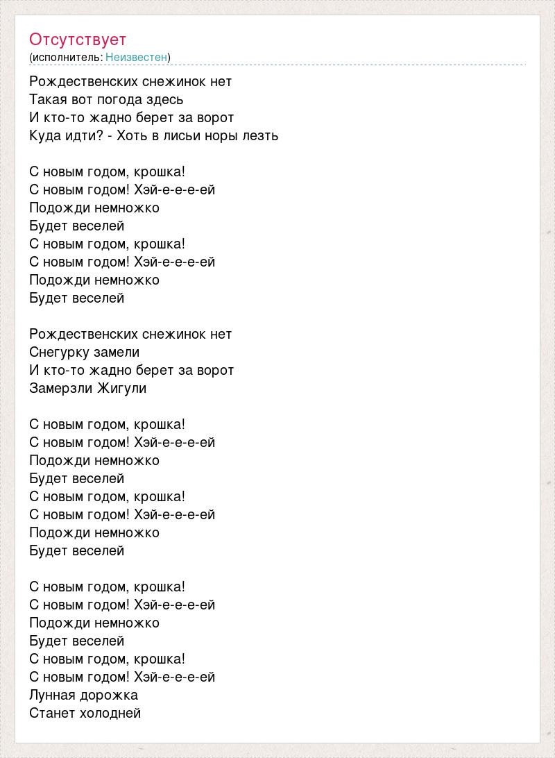 Рождественских снежинок нет Такая вот погода здесь И кто-то жадно берет за ворот Куда идти? - Хоть в лисьи норы лезть С новым годом, крошка! С новым годом! Хэй-е-е-е-ей Подожди немножко Будет веселей С новым годом, крошка! С новым годом! Хэй-е-е-е-ей Подожди немножко Будет веселей Рождественских снежинок нет Снегурку замели И кто-то жадно берет за ворот Замерзли Жигули С новым годом, крошка! С новым годом! Хэй-е-е-е-ей Подожди немножко Будет веселей С новым годом, крошка! С новым годом! Хэй-е-е-е-ей Подожди немножко Будет веселей С новым годом, крошка! С новым годом! Хэй-е-е-е-ей Подожди немножко Будет веселей С новым годом, крошка! С новым годом! Хэй-е-е-е-ей Лунная дорожка Станет холодней