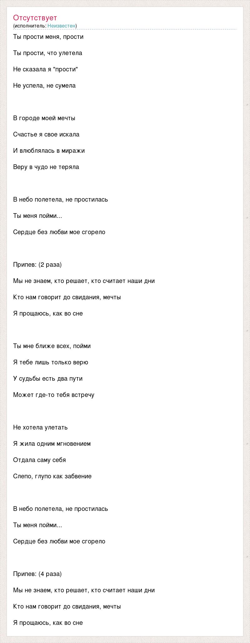 Ты прости меня, прости Ты прости, что улетела Не сказала я "прости" Не успела, не сумела В городе моей мечты Счастье я свое искала И влюблялась в миражи Веру в чудо не теряла В небо полетела, не простилась Ты меня пойми... Сердце без любви мое сгорело Припев: (2 раза) Мы не знаем, кто решает, кто считает наши дни Кто нам говорит до свидания, мечты Я прощаюсь, как во сне Ты мне ближе всех, пойми Я тебе лишь только верю У судьбы есть два пути Может где-то тебя встречу Не хотела улетать Я жила одним мгновением Отдала саму себя Слепо, глупо как забвение В небо полетела, не простилась Ты меня пойми... Сердце без любви мое сгорело Припев: (4 раза) Мы не знаем, кто решает, кто считает наши дни Кто нам говорит до свидания, мечты Я прощаюсь, как во сне