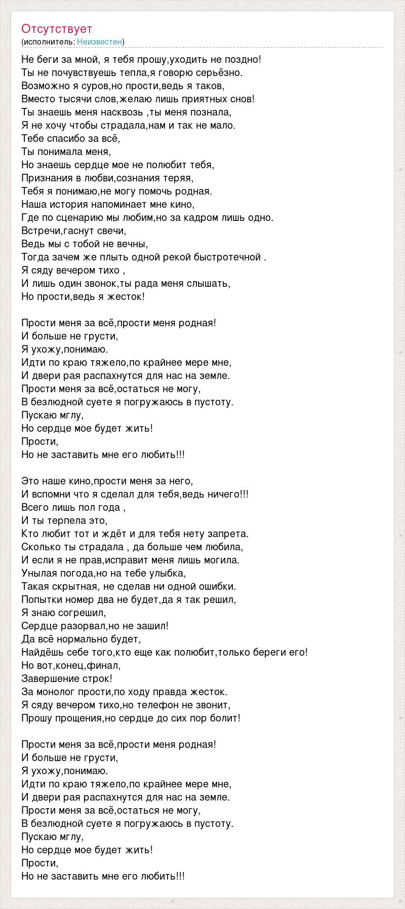 Не беги за мной, я тебя прошу,уходить не поздно! Ты не почувствуешь тепла,я говорю серьёзно. Возможно я суров,но прости,ведь я таков, Вместо тысячи слов,желаю лишь приятных снов! Ты знаешь меня насквозь ,ты меня познала, Я не хочу чтобы страдала,нам и так не мало. Тебе спасибо за всё, Ты понимала меня, Но знаешь сердце мое не полюбит тебя, Признания в любви,сознания теряя, Тебя я понимаю,не могу помочь родная. Наша история напоминает мне кино, Где по сценарию мы любим,но за кадром лишь одно. Встречи,гаснут свечи, Ведь мы с тобой не вечны, Тогда зачем же плыть одной рекой быстротечной . Я сяду вечером тихо , И лишь один звонок,ты рада меня слышать, Но прости,ведь я жесток! Прости меня за всё,прости меня родная! И больше не грусти, Я ухожу,понимаю. Идти по краю тяжело,по крайнее мере мне, И двери рая распахнутся для нас на земле. Прости меня за всё,остаться не могу, В безлюдной суете я погружаюсь в пустоту. Пускаю мглу, Но сердце мое будет жить! Прости, Но не заставить мне его любить!!! Это наше кино,прости меня за него, И вспомни что я сделал для тебя,ведь ничего!!! Всего лишь пол года , И ты терпела это, Кто любит тот и ждёт и для тебя нету запрета. Сколько ты страдала , да больше чем любила, И если я не прав,исправит меня лишь могила. Унылая погода,но на тебе улыбка, Такая скрытная, не сделав ни одной ошибки. Попытки номер два не будет,да я так решил, Я знаю согрешил, Сердце разорвал,но не зашил! Да всё нормально будет, Найдёшь себе того,кто еще как полюбит,только береги его! Но вот,конец,финал, Завершение строк! За монолог прости,по ходу правда жесток. Я сяду вечером тихо,но телефон не звонит, Прошу прощения,но сердце до сих пор болит! Прости меня за всё,прости меня родная! И больше не грусти, Я ухожу,понимаю. Идти по краю тяжело,по крайнее мере мне, И двери рая распахнутся для нас на земле. Прости меня за всё,остаться не могу, В безлюдной суете я погружаюсь в пустоту. Пускаю мглу, Но сердце мое будет жить! Прости, Но не заставить мне его любить!!!