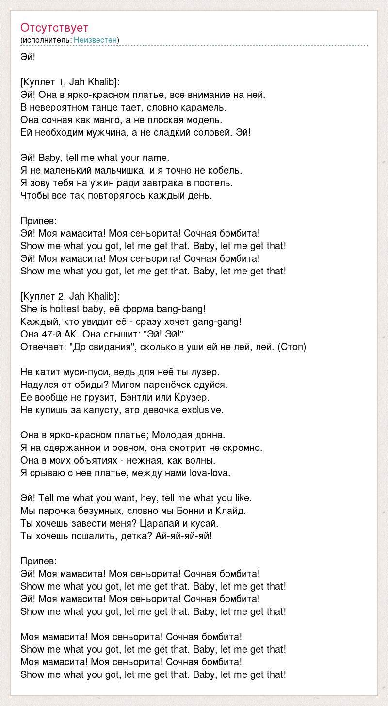Эй! [Куплет 1, Jah Khalib]: Эй! Она в ярко-красном платье, все внимание на ней. В невероятном танце тает, словно карамель. Она сочная как манго, а не плоская модель. Ей необходим мужчина, а не сладкий соловей. Эй! Эй! Baby, tell me what your name. Я не маленький мальчишка, и я точно не кобель. Я зову тебя на ужин ради завтрака в постель. Чтобы все так повторялось каждый день. Припев: Эй! Моя мамасита! Моя сеньорита! Сочная бомбита! Show me what you got, let me get that. Baby, let me get that! Эй! Моя мамасита! Моя сеньорита! Сочная бомбита! Show me what you got, let me get that. Baby, let me get that! [Куплет 2, Jah Khalib]: She is hottest baby, её форма bang-bang! Каждый, кто увидит её - сразу хочет gang-gang! Она 47-й АК. Она слышит: "Эй! Эй!" Отвечает: "До свидания", сколько в уши ей не лей, лей. (Стоп) Не катит муси-пуси, ведь для неё ты лузер. Надулся от обиды? Мигом паренёчек сдуйся. Ее вообще не грузит, Бэнтли или Крузер. Не купишь за капусту, это девочка exclusive. Она в ярко-красном платье; Молодая донна. Я на сдержанном и ровном, она смотрит не скромно. Она в моих объятиях - нежная, как волны. Я срываю с нее платье, между нами lova-lova. Эй! Tell me what you want, hey, tell me what you like. Мы парочка безумных, словно мы Бонни и Клайд. Ты хочешь завести меня? Царапай и кусай. Ты хочешь пошалить, детка? Ай-яй-яй-яй! Припев: Эй! Моя мамасита! Моя сеньорита! Сочная бомбита! Show me what you got, let me get that. Baby, let me get that! Эй! Моя мамасита! Моя сеньорита! Сочная бомбита! Show me what you got, let me get that. Baby, let me get that! Моя мамасита! Моя сеньорита! Сочная бомбита! Show me what you got, let me get that. Baby, let me get that! Моя мамасита! Моя сеньорита! Сочная бомбита! Show me what you got, let me get that. Baby, let me get that!