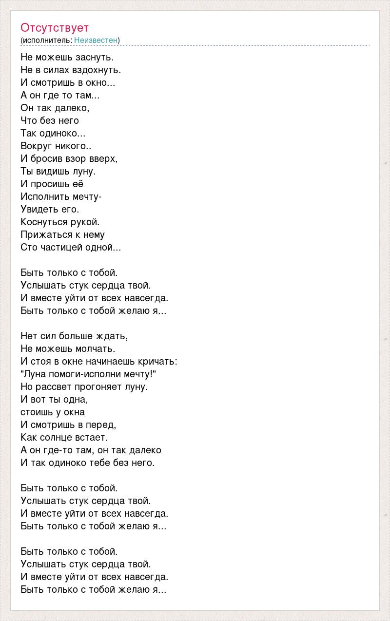 Не можешь заснуть. Не в силах вздохнуть. И смотришь в окно... А он где то там... Он так далеко, Что без него Так одиноко... Вокруг никого.. И бросив взор вверх, Ты видишь луну. И просишь её Исполнить мечту- Увидеть его. Коснуться рукой. Прижаться к нему Сто частицей одной... Быть только с тобой. Услышать стук сердца твой. И вместе уйти от всех навсегда. Быть только с тобой желаю я... Нет сил больше ждать, Не можешь молчать. И стоя в окне начинаешь кричать: "Луна помоги-исполни мечту!" Но рассвет прогоняет луну. И вот ты одна, стоишь у окна И смотришь в перед, Как солнце встает. А он где-то там, он так далеко И так одиноко тебе без него. Быть только с тобой. Услышать стук сердца твой. И вместе уйти от всех навсегда. Быть только с тобой желаю я... Быть только с тобой. Услышать стук сердца твой. И вместе уйти от всех навсегда. Быть только с тобой желаю я...