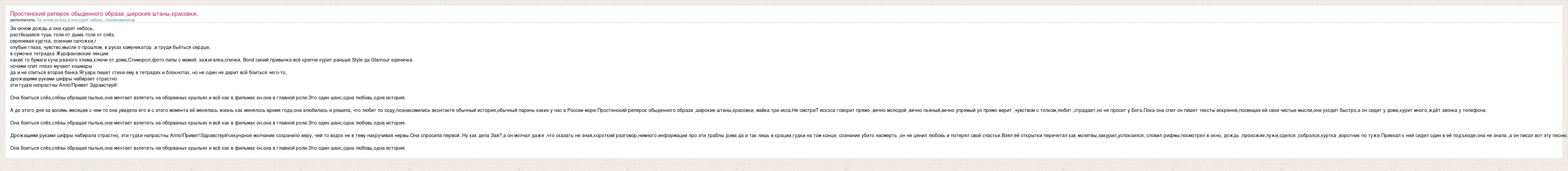 За окном дождь,а она курит небось, растёкшаяся тушь толи от дыма толи от слёз, сереневая куртка, осеннии сапожки,г олубые глаза, чувство,мысли о прошлом, в руках камуникатор ,в груди бьёться сердце, в сумочке тетрадка Журфаковские лекции какие то бумаги куча разного хлама,ключи от дома,Стиморол,фото папы с мамой, зажигалка,спички, Bond синий привычка всё крепче курит раньше Style да Glamour еденичка ночами спит плохо мучают кошмары да и не спиться вторая банка Ягуара пишет стихи ему в тетрадях и блокнотах, но не один не дарит всё боиться чего-то, дрожащими руками цифры набирает страстно эти гудки напрастны Алло!Привет Здравствуй! Она боиться слёз,слёзы обращая пылью,она мечтает взлететь на оборваных крыльях и всё как в фильмах он,она в главной роли.Это один шанс,одна любовь,одна история. А до этого дня за восемь месяцев с чем-то она увидела его и с этого момента её менялась жизнь как менялось время года,она влюбилась и решила, что любит по ходу,познакомились вконтакте обычный история,обычный парень каких у нас в России море.Простенский реперок обыденного образа ,широкие штаны,красовки, майка три икса.Не смотриТ искоса говорит прямо ,вечно молодой ,вечно пьяный,вечно упрямый yo прямо верит ,чувством с толком,любит ,страдает,но не просит у Бога.Пока она спит он пишет тексты искренне,посвещая ей свои чистые мысли,она уходит быстро,а он сидит у дома,курит много,ждёт звонка у телефона. Она боиться слёз,слёзы обращая пылью,она мечтает взлететь на оборваных крыльях и всё как в фильмах он,она в главной роли.Это один шанс,одна любовь,одна история. Дрожащими руками цифры набирала страстно, эти гудки напрастны Алло!Привет!Здравствуй!секундное молчание сохранило веру, чей то вздох не в тему накручивая нервы.Она спросила первой.:Ну как дела Зая?,а он молчал даже ,что сказать не зная,короткий разговор,немного информации про эти траблы дома да и так лишь в крации,гудки на том конце, сознание убито насмерть ,он не ценил любовь и потерял своё счастье.Взял её открытки перечетал как молитвы,закурил,успокоился, словил рифмы,посмотрел в окно, дождь ,прохожие,лужи,оделся ,собрался,куртка ,воротник по туже.Приехал к ней сидел один в её подъезде,она не знала ,а он писал вот эту песню. Она боиться слёз,слёзы обращая пылью,она мечтает взлететь на оборваных крыльях и всё как в фильмах он,она в главной роли.Это один шанс,одна любовь,одна история.