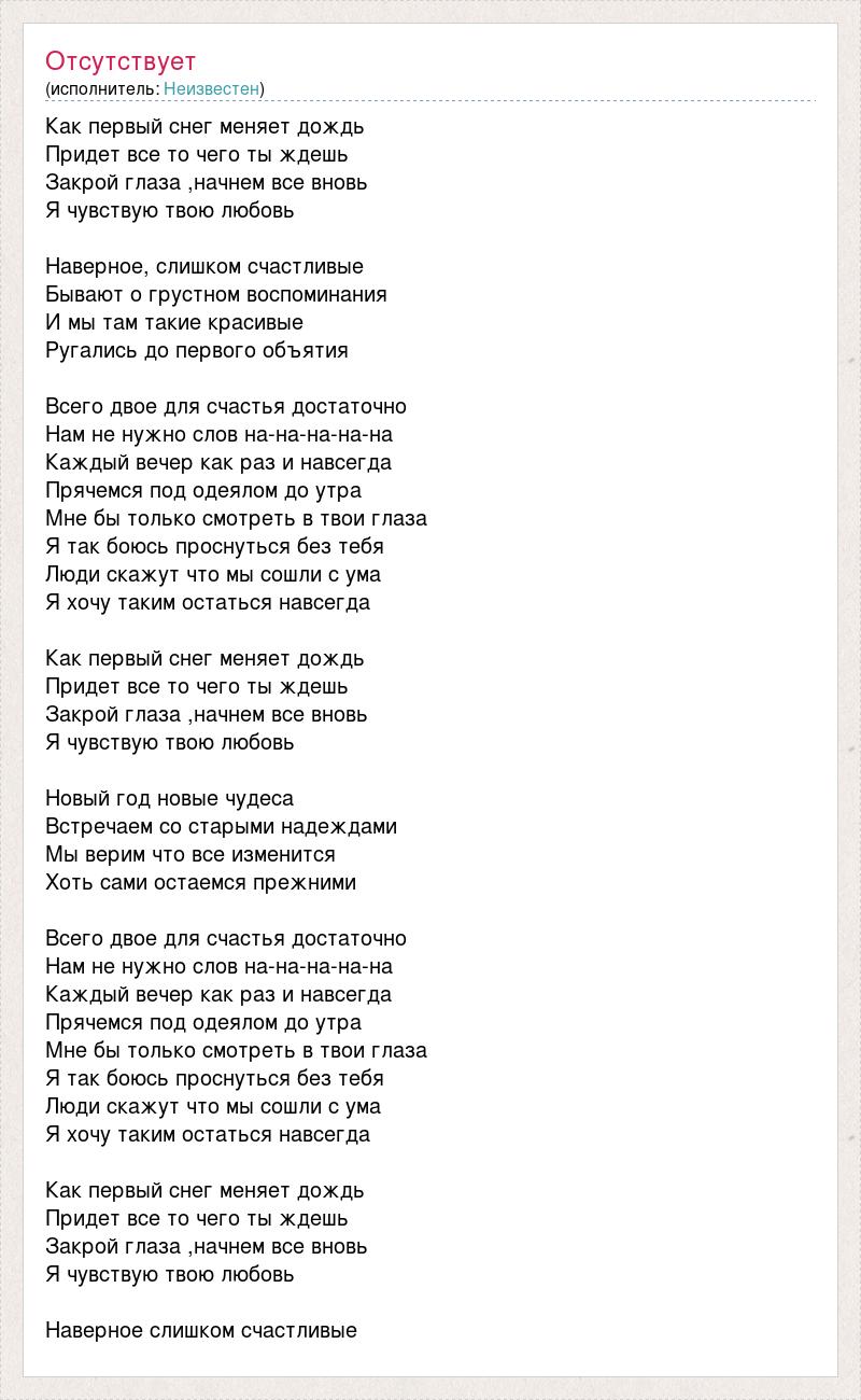 Как первый снег меняет дождь Придет все то чего ты ждешь Закрой глаза ,начнем все вновь Я чувствую твою любовь Наверное, слишком счастливые Бывают о грустном воспоминания И мы там такие красивые Ругались до первого объятия Всего двое для счастья достаточно Нам не нужно слов на-на-на-на-на Каждый вечер как раз и навсегда Прячемся под одеялом до утра Мне бы только смотреть в твои глаза Я так боюсь проснуться без тебя Люди скажут что мы сошли с ума Я хочу таким остаться навсегда Как первый снег меняет дождь Придет все то чего ты ждешь Закрой глаза ,начнем все вновь Я чувствую твою любовь Новый год новые чудеса Встречаем со старыми надеждами Мы верим что все изменится Хоть сами остаемся прежними Всего двое для счастья достаточно Нам не нужно слов на-на-на-на-на Каждый вечер как раз и навсегда Прячемся под одеялом до утра Мне бы только смотреть в твои глаза Я так боюсь проснуться без тебя Люди скажут что мы сошли с ума Я хочу таким остаться навсегда Как первый снег меняет дождь Придет все то чего ты ждешь Закрой глаза ,начнем все вновь Я чувствую твою любовь Наверное слишком счастливые