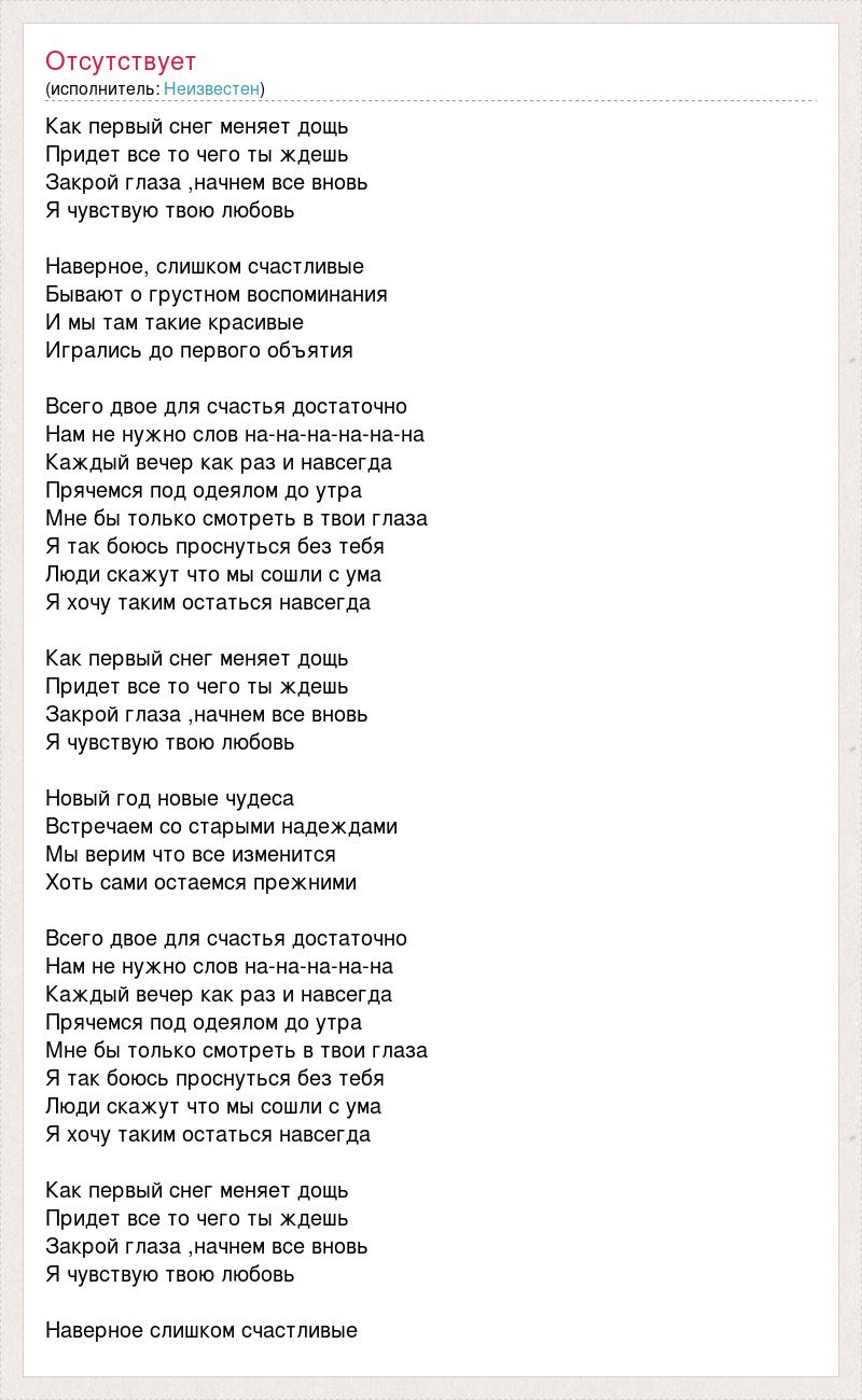 Как первый снег меняет дощь Придет все то чего ты ждешь Закрой глаза ,начнем все вновь Я чувствую твою любовь Наверное, слишком счастливые Бывают о грустном воспоминания И мы там такие красивые Игрались до первого объятия Всего двое для счастья достаточно Нам не нужно слов на-на-на-на-на-на Каждый вечер как раз и навсегда Прячемся под одеялом до утра Мне бы только смотреть в твои глаза Я так боюсь проснуться без тебя Люди скажут что мы сошли с ума Я хочу таким остаться навсегда Как первый снег меняет дощь Придет все то чего ты ждешь Закрой глаза ,начнем все вновь Я чувствую твою любовь Новый год новые чудеса Встречаем со старыми надеждами Мы верим что все изменится Хоть сами остаемся прежними Всего двое для счастья достаточно Нам не нужно слов на-на-на-на-на Каждый вечер как раз и навсегда Прячемся под одеялом до утра Мне бы только смотреть в твои глаза Я так боюсь проснуться без тебя Люди скажут что мы сошли с ума Я хочу таким остаться навсегда Как первый снег меняет дощь Придет все то чего ты ждешь Закрой глаза ,начнем все вновь Я чувствую твою любовь Наверное слишком счастливые