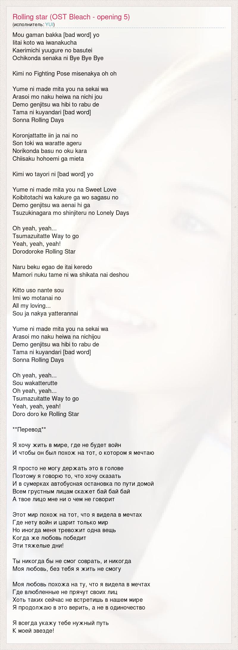Mou gaman bakka [bad word] yo Iitai koto wa iwanakucha Kaerimichi yuugure no basutei Ochikonda senaka ni Bye Bye Bye Kimi no Fighting Pose misenakya oh oh Yume ni made mita you na sekai wa Arasoi mo naku heiwa na nichi jou Demo genjitsu wa hibi to rabu de Tama ni kuyandari [bad word] Sonna Rolling Days Koronjattatte iin ja nai no Son toki wa waratte ageru Norikonda basu no oku kara Chiisaku hohoemi ga mieta Kimi wo tayori ni [bad word] yo Yume ni made mita you na Sweet Love Koibitotachi wa kakure ga wo sagasu no Demo genjitsu wa aenai hi ga Tsuzukinagara mo shinjiteru no Lonely Days Oh yeah, yeah... Tsumazuitatte Way to go Yeah, yeah, yeah! Dorodoroke Rolling Star Naru beku egao de itai keredo Mamori nuku tame ni wa shikata nai deshou Kitto uso nante sou Imi wo motanai no All my loving... Sou ja nakya yatterannai Yume ni made mita you na sekai wa Arasoi mo naku heiwa na nichijou Demo genjitsu wa hibi to rabu de Tama ni kuyandari [bad word] Sonna Rolling Days Oh yeah, yeah... Sou wakatterutte Oh yeah, yeah... Tsumazuitatte Way to go Yeah, yeah, yeah! Doro doro ke Rolling Star **Перевод** Я хочу жить в мире, где не будет войн И чтобы он был похож на тот, о котором я мечтаю Я просто не могу держать это в голове Поэтому я говорю то, что хочу сказать И в сумерках автобусная остановка по пути домой Всем грустным лицам скажет бай бай бай А твое лицо мне ни о чем не говорит Этот мир похож на тот, что я видела в мечтах Где нету войн и царит только мир Но иногда меня тревожит одна вещь Когда же любовь победит Эти тяжелые дни! Ты никогда бы не смог соврать, и никогда Моя любовь, без тебя я жить не смогу Моя любовь похожа на ту, что я видела в мечтах Где влюбленные не прячут своих лиц Хоть таких сейчас не встретишь в нашем мире Я продолжаю в это верить, а не в одиночество Я всегда укажу тебе нужный путь К моей звезде!