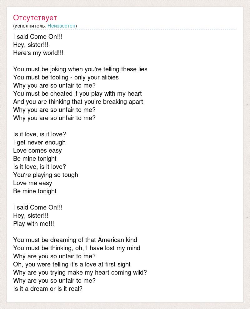 I said Come On!!! Hey, sister!!! Here's my world!!! You must be joking when you're telling these lies You must be fooling - only your alibies Why you are so unfair to me? You must be cheated if you play with my heart And you are thinking that you're breaking apart Why you are so unfair to me? Why you are so unfair to me? Is it love, is it love? I get never enough Love comes easy Be mine tonight Is it love, is it love? You're playing so tough Love me easy Be mine tonight I said Come On!!! Hey, sister!!! Play with me!!! You must be dreaming of that American kind You must be thinking, oh, I have lost my mind Why are you so unfair to me? Oh, you were telling it's a love at first sight Why are you trying make my heart coming wild? Why are you so unfair to me? Is it a dream or is it real?