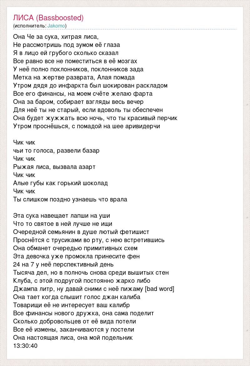 Она Че за сука, хитрая лиса, Не рассмотришь под зумом её глаза Я в лицо ей грубого сколько сказал Все равно все не поместиться в её мозгах У неё полно поклонников, поклонников зада Метка на жертве разврата, Алая помада Утром дядя до инфаркта был шокирован раскладом Все его финансы, на моем счёте желаю фарта Она за баром, собирает взгляды весь вечер Для неё ты не старый, если вдоволь ты обеспечен Она будет жужжать всю ночь, что ты красивый перчик Утром проснёшься, с помадой на шее аривидерчи Чик чик чьи то голоса, развели базар Чик чик Рыжая лиса, вызвала азарт Чик чик Алые губы как горький шоколад Чик чик Ты слишком поздно узнаешь что врала Эта сука навещает лапши на уши Что то святое в ней лучше не ищи Очередной семьянин в душе лютый фетишист Проснётся с трусиками во рту, с нею встретившись Она обманет очередью примитивных схем Эта девочка уже промокла принесите фен 24 на 7 у неё перспективный день Тысяча дел, но в полночь снова среди вышитых стен Клуба, с этой подругой постоянно жарко либо Джампа литр, ну давай сними с неё пижаму [bad word] Она тает когда слышит голос джан калиба Товарищи её не интересует ваш калибр Все финансы нового дружка, она сама поделит Сколько добровольцев от её вида потели Все её измены, заканчиваются у постели Она настоящая лиса, она мой подельник 13:30:40