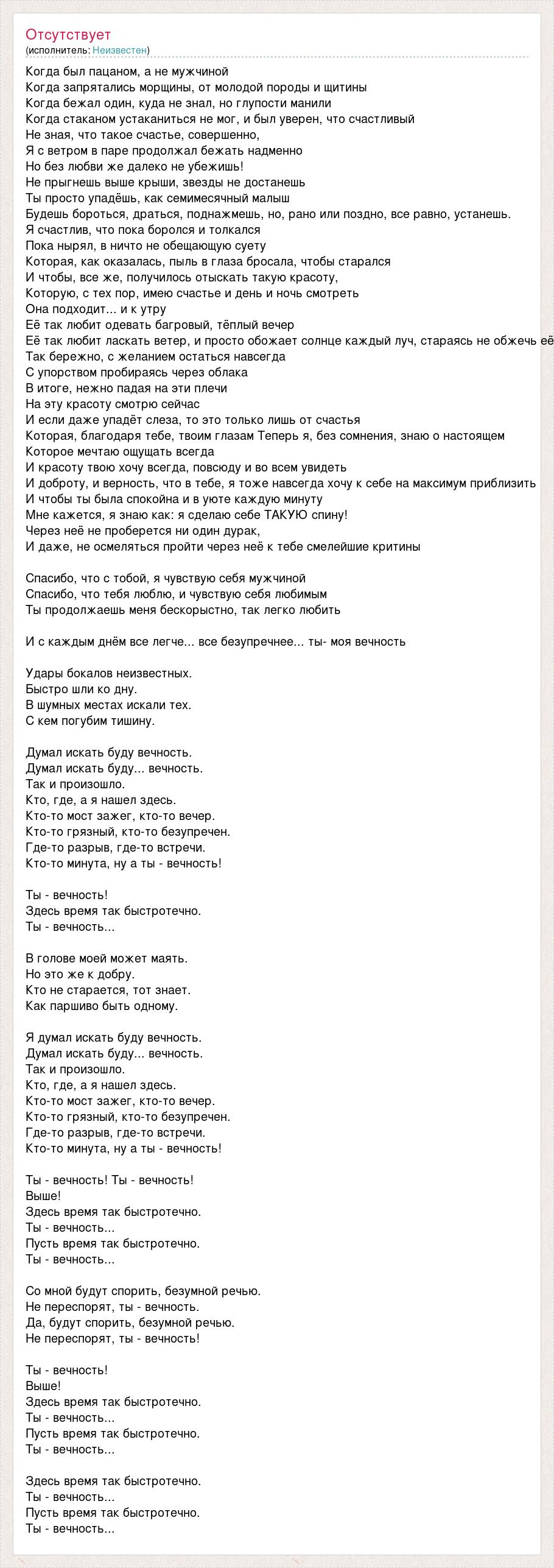 Когда был пацаном, а не мужчиной Когда запрятались морщины, от молодой породы и щитины Когда бежал один, куда не знал, но глупости манили Когда стаканом устаканиться не мог, и был уверен, что счастливый Не зная, что такое счастье, совершенно, Я с ветром в паре продолжал бежать надменно Но без любви же далеко не убежишь! Не прыгнешь выше крыши, звезды не достанешь Ты просто упадёшь, как семимесячный малыш Будешь бороться, драться, поднажмешь, но, рано или поздно, все равно, устанешь. Я счастлив, что пока боролся и толкался Пока нырял, в ничто не обещающую суету Которая, как оказалась, пыль в глаза бросала, чтобы старался И чтобы, все же, получилось отыскать такую красоту, Которую, с тех пор, имею счастье и день и ночь смотреть Она подходит... и к утру Её так любит одевать багровый, тёплый вечер Её так любит ласкать ветер, и просто обожает солнце каждый луч, стараясь не обжечь её Так бережно, с желанием остаться навсегда С упорством пробираясь через облака В итоге, нежно падая на эти плечи На эту красоту смотрю сейчас И если даже упадёт слеза, то это только лишь от счастья Которая, благодаря тебе, твоим глазам Теперь я, без сомнения, знаю о настоящем Которое мечтаю ощущать всегда И красоту твою хочу всегда, повсюду и во всем увидеть И доброту, и верность, что в тебе, я тоже навсегда хочу к себе на максимум приблизить И чтобы ты была спокойна и в уюте каждую минуту Мне кажется, я знаю как: я сделаю себе ТАКУЮ спину! Через неё не проберется ни один дурак, И даже, не осмеляться пройти через неё к тебе смелейшие критины Спасибо, что с тобой, я чувствую себя мужчиной Спасибо, что тебя люблю, и чувствую себя любимым Ты продолжаешь меня бескорыстно, так легко любить И с каждым днём все легче... все безупречнее... ты- моя вечность Удары бокалов неизвестных. Быстро шли ко дну. В шумных местах искали тех. С кем погубим тишину. Думал искать буду вечность. Думал искать буду... вечность. Так и произошло. Кто, где, а я нашел здесь. Кто-то мост зажег, кто-то вечер. Кто-то грязный, кто-то безупречен. Где-то разрыв, где-то встречи. Кто-то минута, ну а ты - вечность! Ты - вечность! Здесь время так быстротечно. Ты - вечность... В голове моей может маять. Но это же к добру. Кто не старается, тот знает. Как паршиво быть одному. Я думал искать буду вечность. Думал искать буду... вечность. Так и произошло. Кто, где, а я нашел здесь. Кто-то мост зажег, кто-то вечер. Кто-то грязный, кто-то безупречен. Где-то разрыв, где-то встречи. Кто-то минута, ну а ты - вечность! Ты - вечность! Ты - вечность! Выше! Здесь время так быстротечно. Ты - вечность... Пусть время так быстротечно. Ты - вечность... Со мной будут спорить, безумной речью. Не переспорят, ты - вечность. Да, будут спорить, безумной речью. Не переспорят, ты - вечность! Ты - вечность! Выше! Здесь время так быстротечно. Ты - вечность... Пусть время так быстротечно. Ты - вечность... Здесь время так быстротечно. Ты - вечность... Пусть время так быстротечно. Ты - вечность...