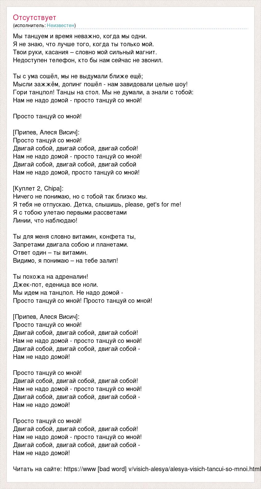 Мы танцуем и время неважно, когда мы одни. Я не знаю, что лучше того, когда ты только мой. Твои руки, касания – словно мой сильный магнит. Недоступен телефон, кто бы нам сейчас не звонил. Ты с ума сошёл, мы не выдумали ближе ещё; Мысли зажжём, допинг пошёл - нам завидовали целые шоу! Гори танцпол! Танцы на стол. Мы не думали, а знали с тобой: Нам не надо домой - просто танцуй со мной! Просто танцуй со мной! [Припев, Алеся Висич]: Просто танцуй со мной! Двигай собой, двигай собой, двигай собой! Нам не надо домой - просто танцуй со мной! Двигай собой, двигай собой, двигай собой Нам не надо домой, просто танцуй со мной! [Куплет 2, Chipa]: Ничего не понимаю, но с тобой так близко мы. Я тебя не отпускаю. Детка, слышишь, please, get's for me! Я с тобою улетаю первыми рассветами Линии, что наблюдаю! Ты для меня словно витамин, конфета ты, Запретами двигала собою и планетами. Ответ один – ты витамин. Видимо, я понимаю – на тебе залип! Ты похожа на адреналин! Джек-пот, еденица все ноли. Мы идем на танцпол. Не надо домой - Просто танцуй со мной! Просто танцуй со мной! [Припев, Алеся Висич]: Просто танцуй со мной! Двигай собой, двигай собой, двигай собой! Нам не надо домой - просто танцуй со мной! Двигай собой, двигай собой, двигай собой - Нам не надо домой! Просто танцуй со мной! Двигай собой, двигай собой, двигай собой! Нам не надо домой - просто танцуй со мной! Двигай собой, двигай собой, двигай собой - Нам не надо домой! Просто танцуй со мной! Двигай собой, двигай собой, двигай собой! Нам не надо домой - просто танцуй со мной! Двигай собой, двигай собой, двигай собой - Нам не надо домой! Читать на сайте: https://www [bad word] v/visich-alesya/alesya-visich-tancui-so-mnoi.html