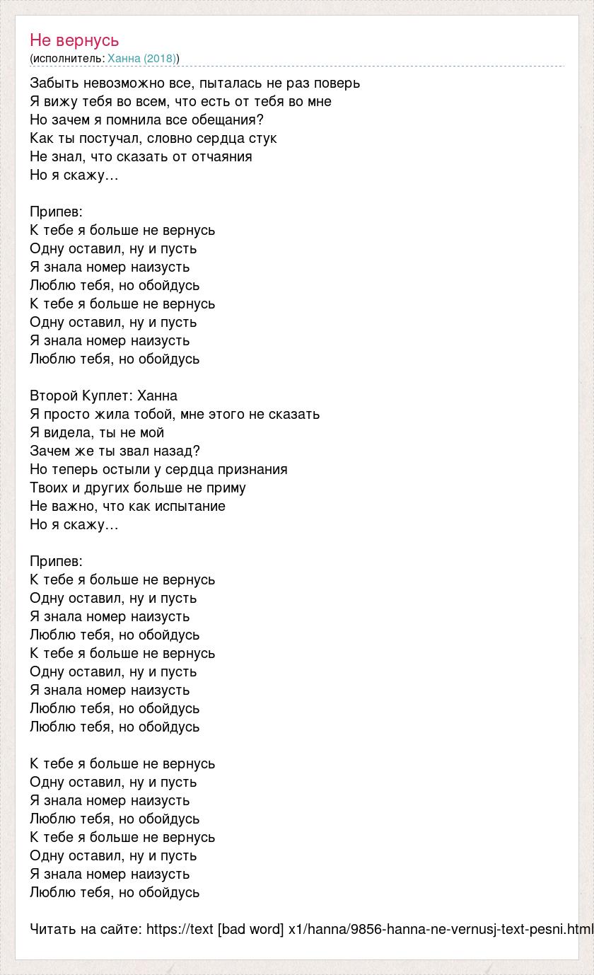 Забыть невозможно все, пыталась не раз поверь Я вижу тебя во всем, что есть от тебя во мне Но зачем я помнила все обещания? Как ты постучал, словно сердца стук Не знал, что сказать от отчаяния Но я скажу… Припев: К тебе я больше не вернусь Одну оставил, ну и пусть Я знала номер наизусть Люблю тебя, но обойдусь К тебе я больше не вернусь Одну оставил, ну и пусть Я знала номер наизусть Люблю тебя, но обойдусь Второй Куплет: Ханна Я просто жила тобой, мне этого не сказать Я видела, ты не мой Зачем же ты звал назад? Но теперь остыли у сердца признания Твоих и других больше не приму Не важно, что как испытание Но я скажу… Припев: К тебе я больше не вернусь Одну оставил, ну и пусть Я знала номер наизусть Люблю тебя, но обойдусь К тебе я больше не вернусь Одну оставил, ну и пусть Я знала номер наизусть Люблю тебя, но обойдусь Люблю тебя, но обойдусь К тебе я больше не вернусь Одну оставил, ну и пусть Я знала номер наизусть Люблю тебя, но обойдусь К тебе я больше не вернусь Одну оставил, ну и пусть Я знала номер наизусть Люблю тебя, но обойдусь Читать на сайте: https://text [bad word] x1/hanna/9856-hanna-ne-vernusj-text-pesni.html