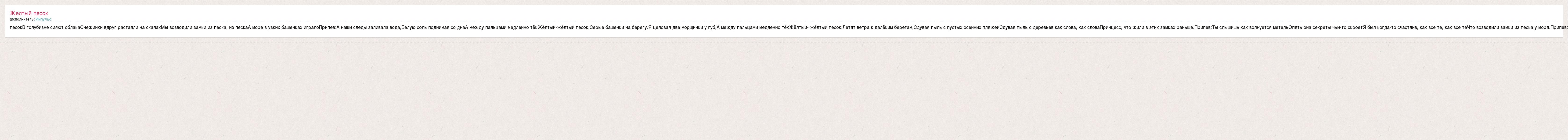 песокВ голубизне сияют облакаСнежинки вдруг растаяли на скалахМы возводили замки из песка, из пескаА море в узких башенках игралоПрипев:А наши следы заливала вода,Белую соль поднимая со днаА между пальцами медленно тёкЖёлтый-жёлтый песок.Серые башенки на берегу.Я целовал две морщинки у губ,А между пальцами медленно тёкЖёлтый- жёлтый песок.Летят ветра к далёким берегам,Сдувая пыль с пустых осенних пляжейСдувая пыль с деревьев как слова, как словаПринцесс, что жили в этих замках раньше.Припев:Ты слышишь как волнуется метельОпять она секреты чьи-то скроетЯ был когда-то счастлив, как все те, как все теЧто возводили замки из песка у моря.Припев: