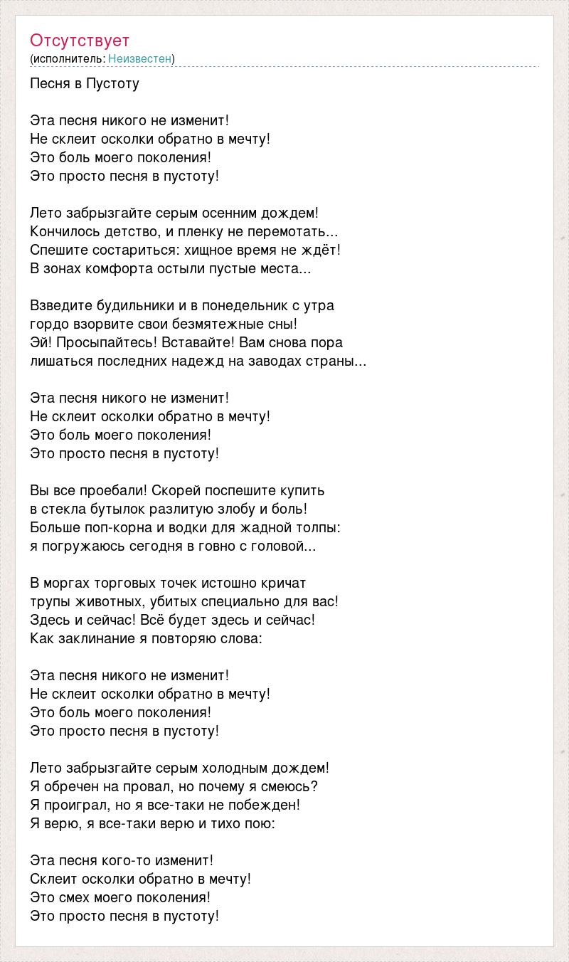 Песня в Пустоту Эта песня никого не изменит! Не склеит осколки обратно в мечту! Это боль моего поколения! Это просто песня в пустоту! Лето забрызгайте серым осенним дождем! Кончилось детство, и пленку не перемотать... Спешите состариться: хищное время не ждёт! В зонах комфорта остыли пустые места... Взведите будильники и в понедельник с утра гордо взорвите свои безмятежные сны! Эй! Просыпайтесь! Вставайте! Вам снова пора лишаться последних надежд на заводах страны... Эта песня никого не изменит! Не склеит осколки обратно в мечту! Это боль моего поколения! Это просто песня в пустоту! Вы все проебали! Скорей поспешите купить в стекла бутылок разлитую злобу и боль! Больше поп-корна и водки для жадной толпы: я погружаюсь сегодня в говно с головой... В моргах торговых точек истошно кричат трупы животных, убитых специально для вас! Здесь и сейчас! Всё будет здесь и сейчас! Как заклинание я повторяю слова: Эта песня никого не изменит! Не склеит осколки обратно в мечту! Это боль моего поколения! Это просто песня в пустоту! Лето забрызгайте серым холодным дождем! Я обречен на провал, но почему я смеюсь? Я проиграл, но я все-таки не побежден! Я верю, я все-таки верю и тихо пою: Эта песня кого-то изменит! Склеит осколки обратно в мечту! Это смех моего поколения! Это просто песня в пустоту!