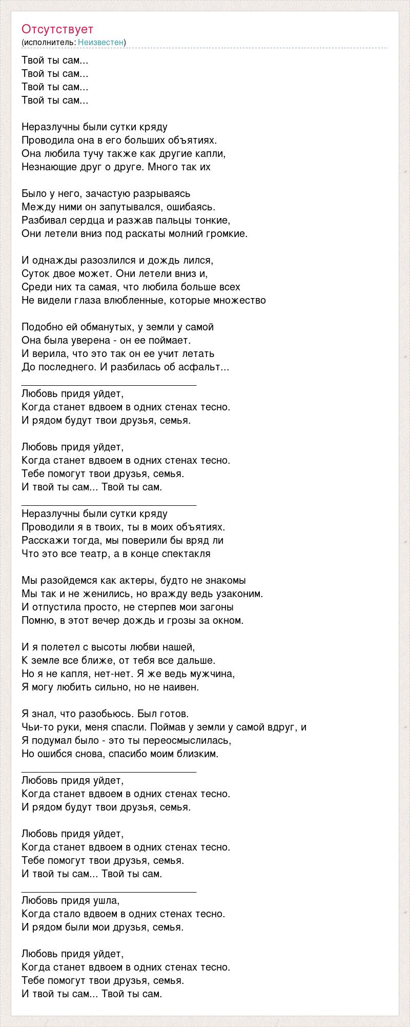 Твой ты сам... Твой ты сам... Твой ты сам... Твой ты сам... Неразлучны были сутки кряду Проводила она в его больших объятиях. Она любила тучу также как другие капли, Незнающие друг о друге. Много так их Было у него, зачастую разрываясь Между ними он запутывался, ошибаясь. Разбивал сердца и разжав пальцы тонкие, Они летели вниз под раскаты молний громкие. И однажды разозлился и дождь лился, Суток двое может. Они летели вниз и, Среди них та самая, что любила больше всех Не видели глаза влюбленные, которые множество Подобно ей обманутых, у земли у самой Она была уверена - он ее поймает. И верила, что это так он ее учит летать До последнего. И разбилась об асфальт... _______________________________ Любовь придя уйдет, Когда станет вдвоем в одних стенах тесно. И рядом будут твои друзья, семья. Любовь придя уйдет, Когда станет вдвоем в одних стенах тесно. Тебе помогут твои друзья, семья. И твой ты сам... Твой ты сам. _______________________________ Неразлучны были сутки кряду Проводили я в твоих, ты в моих объятиях. Расскажи тогда, мы поверили бы вряд ли Что это все театр, а в конце спектакля Мы разойдемся как актеры, будто не знакомы Мы так и не женились, но вражду ведь узаконим. И отпустила просто, не стерпев мои загоны Помню, в этот вечер дождь и грозы за окном. И я полетел с высоты любви нашей, К земле все ближе, от тебя все дальше. Но я не капля, нет-нет. Я же ведь мужчина, Я могу любить сильно, но не наивен. Я знал, что разобьюсь. Был готов. Чьи-то руки, меня спасли. Поймав у земли у самой вдруг, и Я подумал было - это ты переосмыслилась, Но ошибся снова, спасибо моим близким. _______________________________ Любовь придя уйдет, Когда станет вдвоем в одних стенах тесно. И рядом будут твои друзья, семья. Любовь придя уйдет, Когда станет вдвоем в одних стенах тесно. Тебе помогут твои друзья, семья. И твой ты сам... Твой ты сам. _______________________________ Любовь придя ушла, Когда стало вдвоем в одних стенах тесно. И рядом были мои друзья, семья. Любовь придя уйдет, Когда станет вдвоем в одних стенах тесно. Тебе помогут твои друзья, семья. И твой ты сам... Твой ты сам.