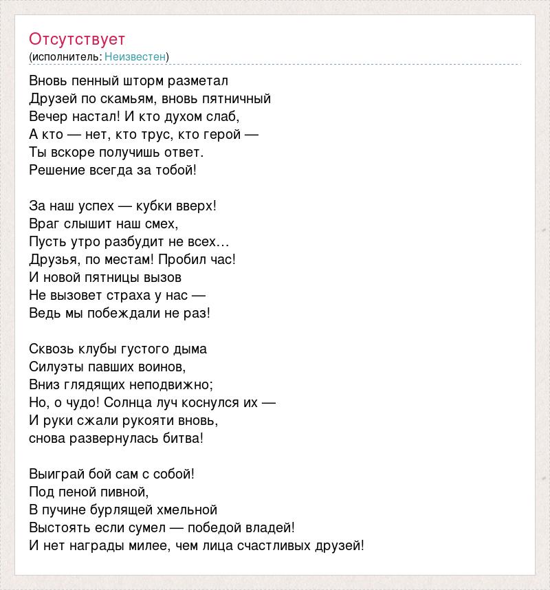Вновь пенный шторм разметал Друзей по скамьям, вновь пятничный Вечер настал! И кто духом слаб, А кто — нет, кто трус, кто герой — Ты вскоре получишь ответ. Решение всегда за тобой! За наш успех — кубки вверх! Враг слышит наш смех, Пусть утро разбудит не всех… Друзья, по местам! Пробил час! И новой пятницы вызов Не вызовет страха у нас — Ведь мы побеждали не раз! Сквозь клубы густого дыма Силуэты павших воинов, Вниз глядящих неподвижно; Но, о чудо! Солнца луч коснулся их — И руки сжали рукояти вновь, снова развернулась битва! Выиграй бой сам с собой! Под пеной пивной, В пучине бурлящей хмельной Выстоять если сумел — победой владей! И нет награды милее, чем лица счастливых друзей!